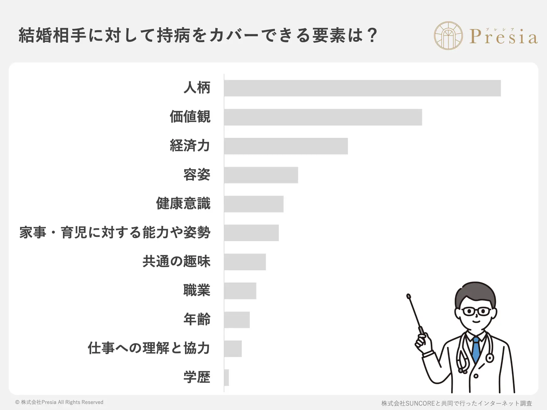 結婚相談所Presia(株式会社Presia)は、20代〜50代の未婚男女200名を対象に、「結婚相手の条件と『持病』」に関する意識調査を実施しました。