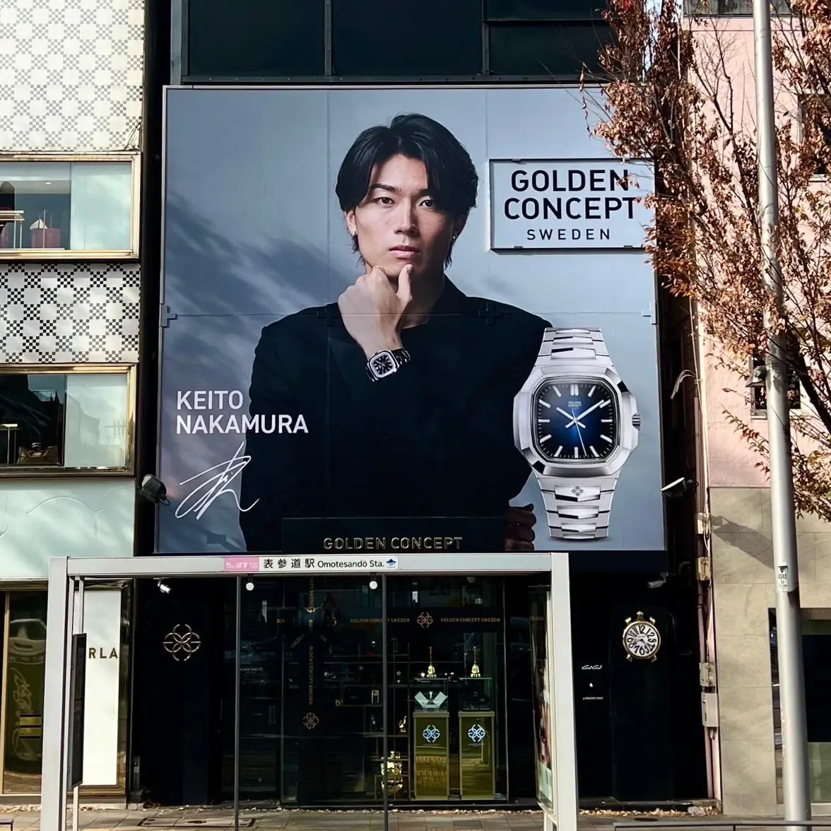 ゴールデンコンセプト表参道店のビルボードがリニューアル。新ビジュアルでは、新作腕時計「Royal Collection」を着用した中村敬斗選手と、着用モデルを大胆に配したデザインを採用。ブランドの新章を象徴する一本と中村選手の存在感が重なり合うことで、視線を引きつける印象的なビジュアルに仕上がっています。表参道にお立ち寄りの際は、ぜひ新たに掲出されたビルボードをご覧ください。