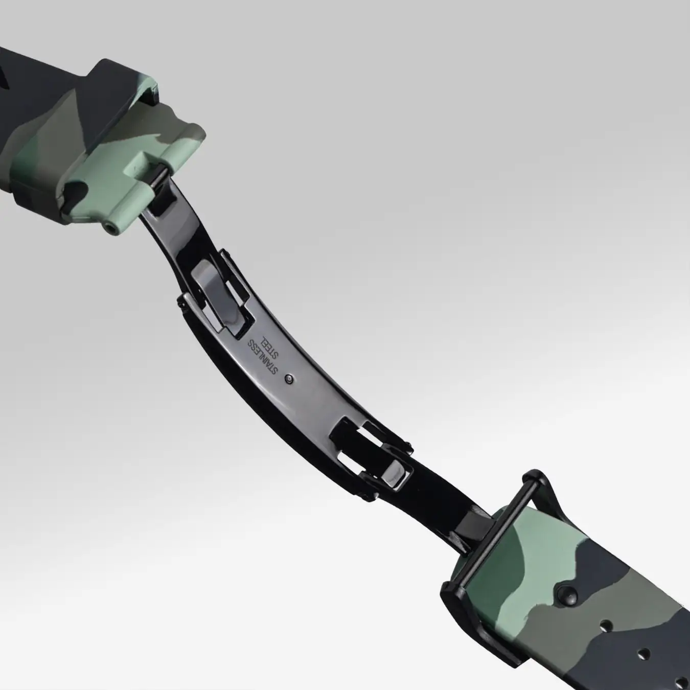 素材には、耐久性と柔軟性を兼ね備えたフルオロエラストマーを採用。独自のマルチカラーモールド製法により、立体感と奥行きのあるカモフラージュパターンを表現しています。カラーは、深みのある色調が特徴の「Midnight Camouflage」と、ミリタリーライクな表情をもつ「Ranger Camouflage」の2色展開です。
