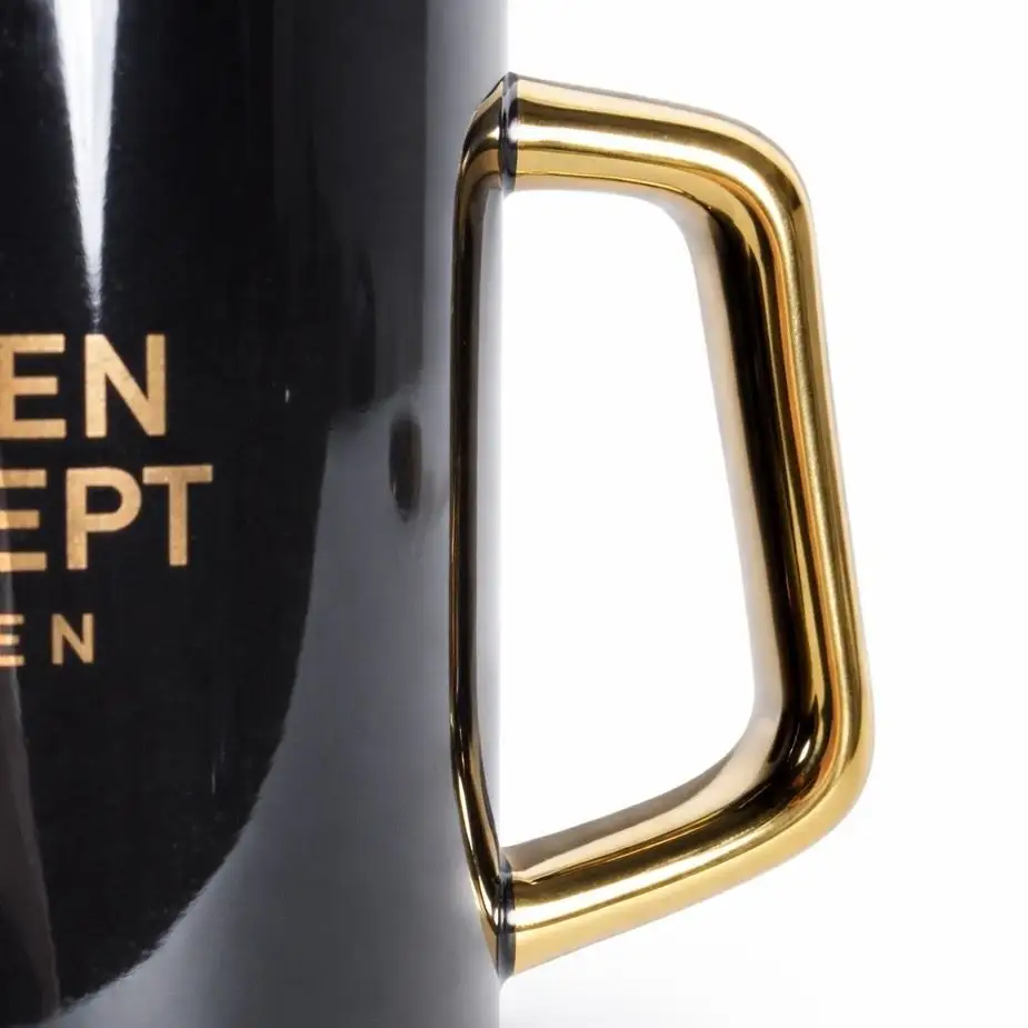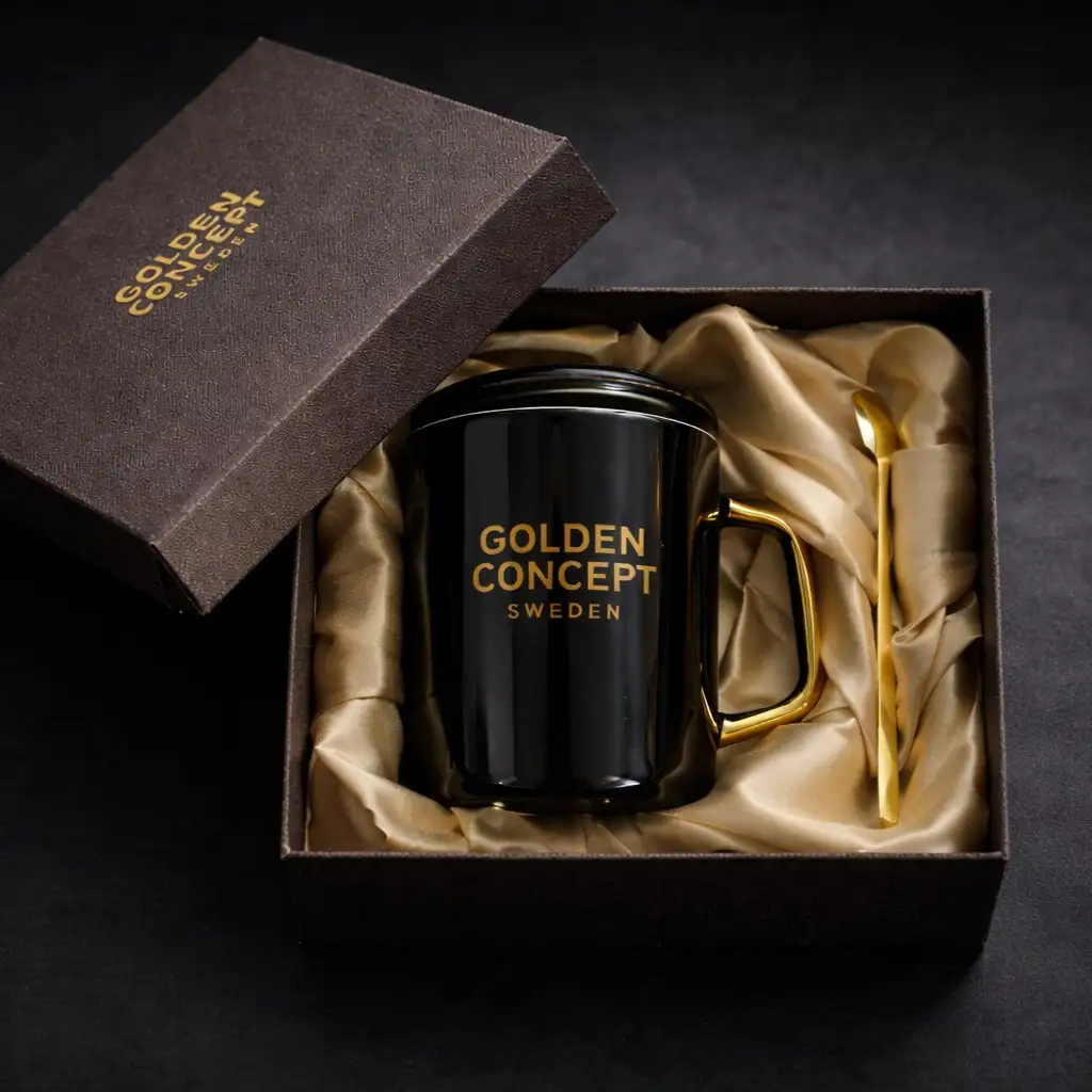 プレゼントとなるマグカップは、ブランドロゴをあしらった限定仕様。ブラックを基調とした本体にゴールドのアクセントを加え、ゴールデンコンセプトらしい上質感のあるデザインに仕上げています。蓋とマドラーが付属したセットとなっており、日常使いしやすい実用的な内容です。