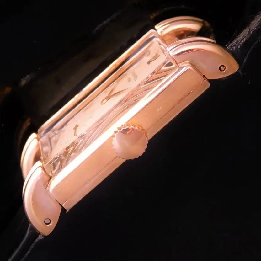 ケースは18Kローズゴールド製で、上下(12時側・6時側)に伸びる細長いラグと段差構造が特徴です。曲面と直線を組み合わせた設計となっています。