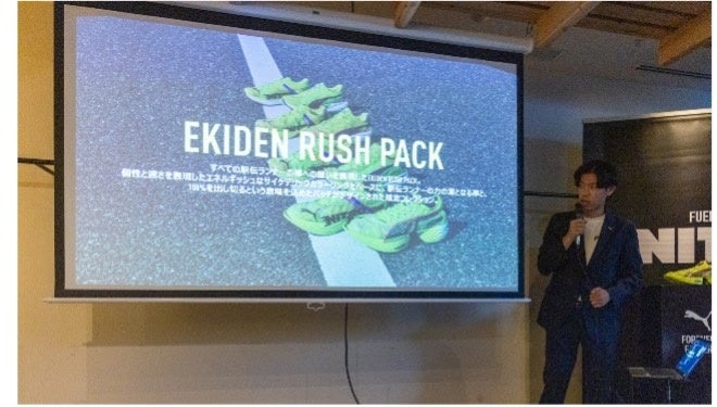 続いて、商品企画本部の担当者より、「EKIDEN RUSH PACK」の各モデルに搭載されたプーマ独自のフォームテクノロジー「NITRO™ ELITE FOAM(ニトロ エリート フォーム)」に関する説明、その4モデルの中でも、国内外の各種レース、国内の駅伝大会にて有力な選手の着用が予定されている注力モデル「FAST-R NITRO™ ELITE 2」に関する走行効率の調査データなどがシェアされました。