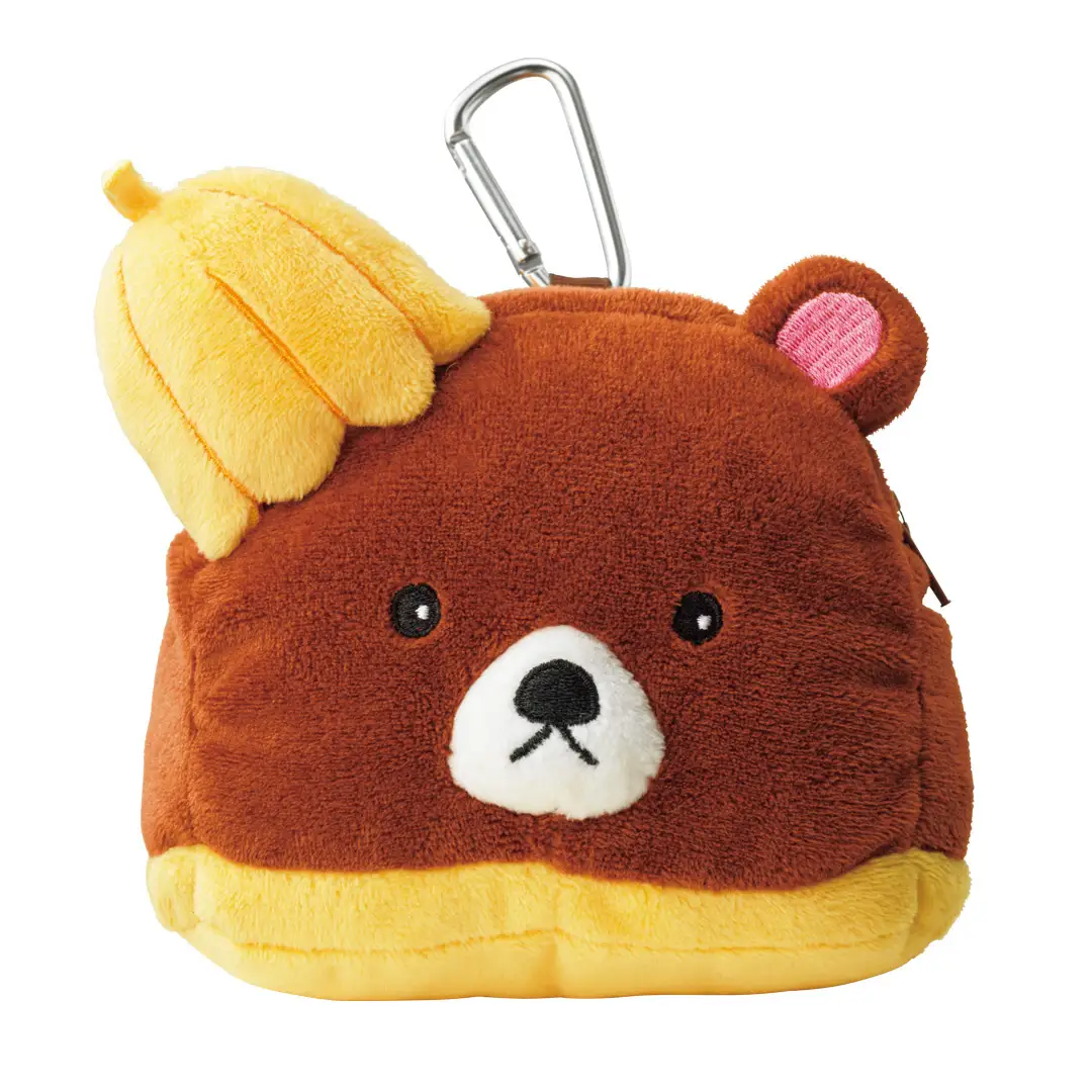 カカオクマの顔をモチーフにしたポーチ。ぬいぐるみのようなふわふわとした手触りです。取り外しができるカラビナ付きでバッグ等に取り付けられます。