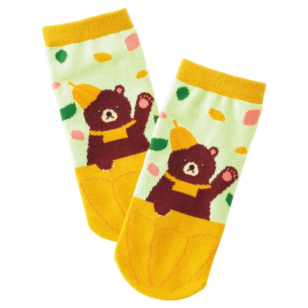 カカオクマとカラフルなカカオポッドをデザインしたくるぶし丈の靴下。サイズは女性やお子様におすすめの18~22(cm)です。