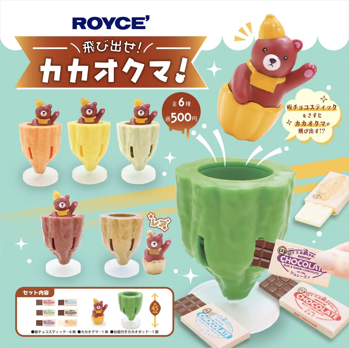 “カカオクマ”が入ったカカオポッドに、小さな板チョコスティックを差し込むとカカオクマが飛び出す、楽しいカプセルトイ。どこに刺したら飛び出すか、ハラハラドキドキのゲームを楽しめます。