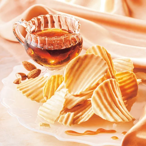 メープルシュガーとアーモンドプラリネペーストを加えたチョコレートを、ポテトチップの片面にコーティング。ポテトチップの塩味とメープルシュガーのやさしい風味が絶妙なバランスです。後味にほんのりナッツが香ります。