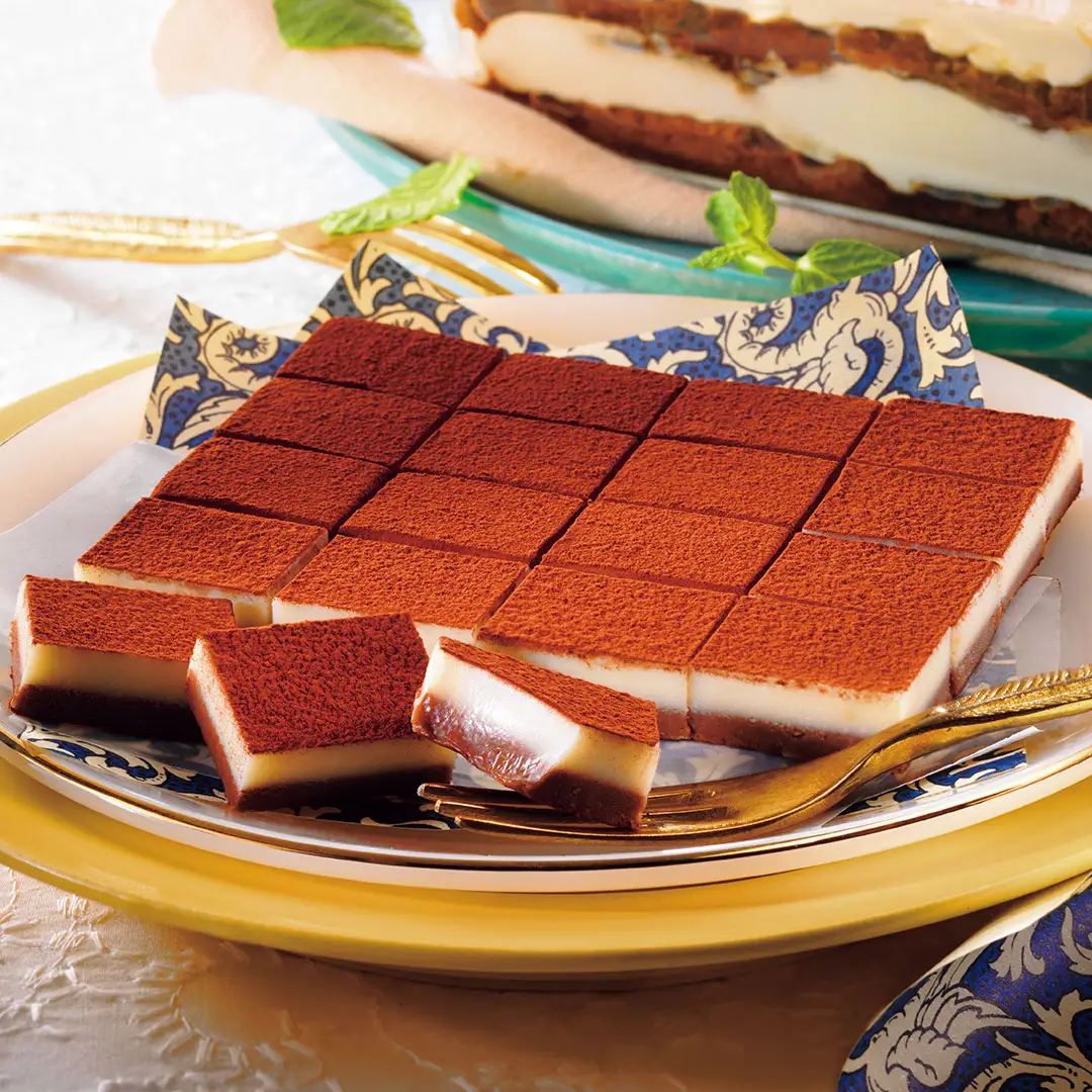 イタリアで生まれたデザート「ティラミス」をイメージした生チョコレート。マスカルポーネチーズのパウダーを入れたホワイトチョコレートのガナッシュと、コーヒーとコーヒーリキュール入りのガナッシュを2層に重ね、ココアパウダーをかけました。チーズのコクとコーヒーの味わいが、それぞれ引き立ちながらもとけ合い、まるでティラミスを食べているかのような風味が広がります。