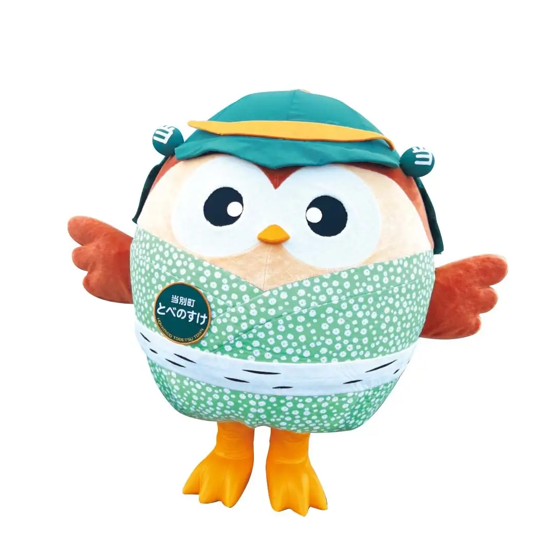 当別町の鳥である「フクロウ」にあこがれていて自分で目のまわりに白色の模様を入れたスズメのキャラクター、とべのすけ。ぜひ一緒に記念撮影をお楽しみください。