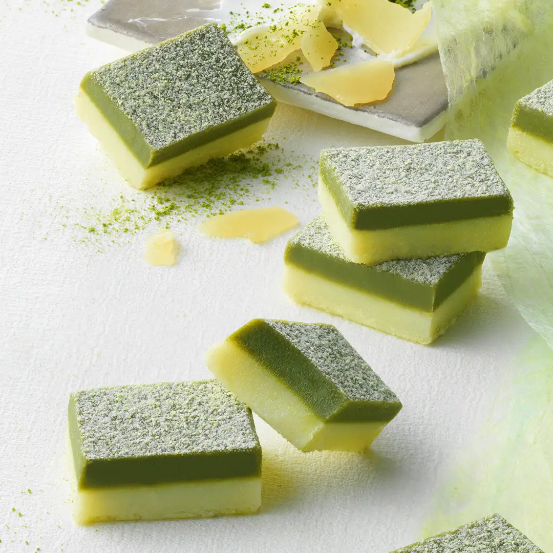 京都府産の宇治抹茶をブレンドしたホワイトチョコレートと、北海道産の3種のチーズ(マスカルポーネ、ゴーダ、クリームチーズ)を使用したホワイトチョコレートを2層に重ね、宇治抹茶を使用したチョコレートのパウダーをかけました。