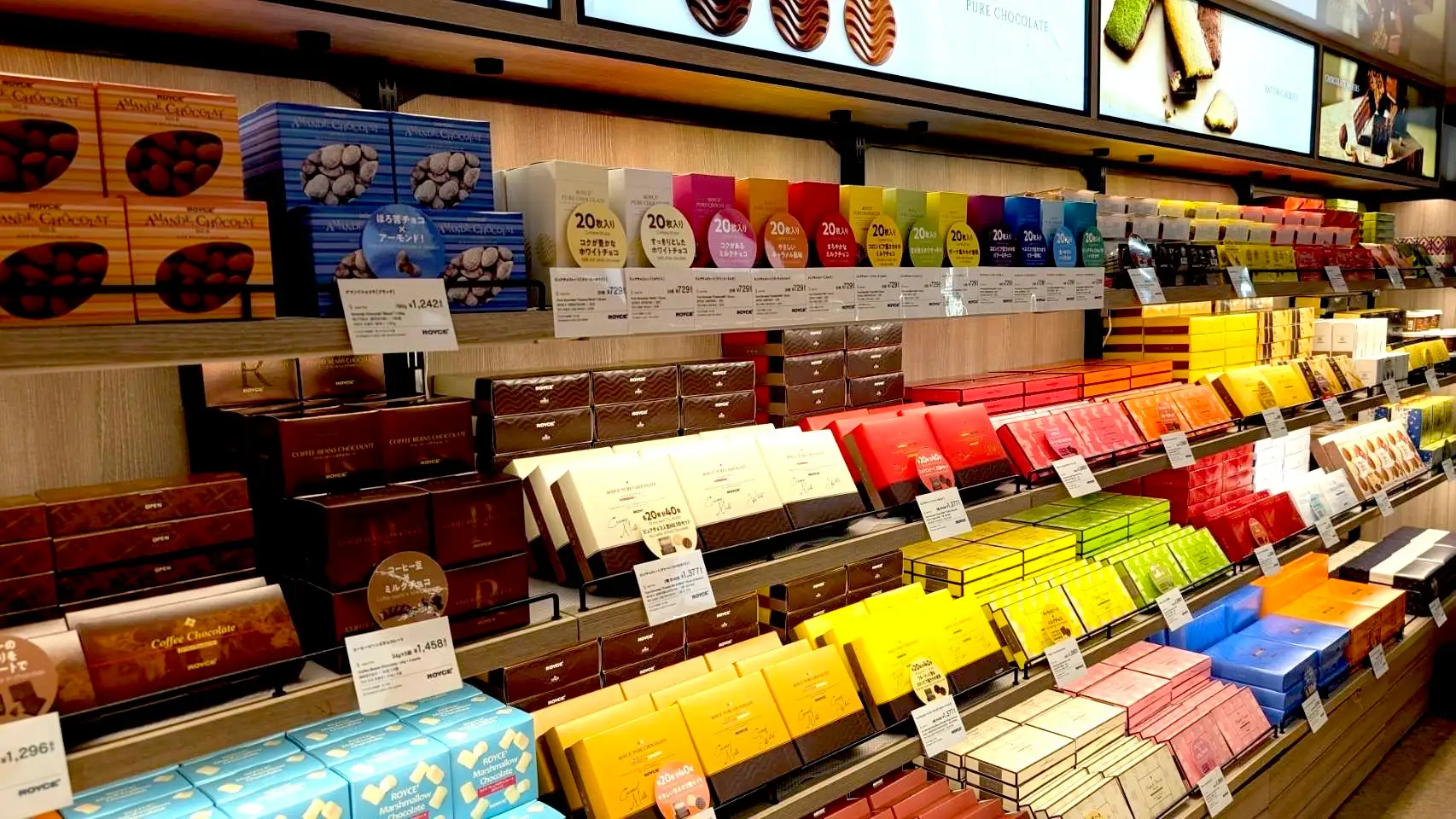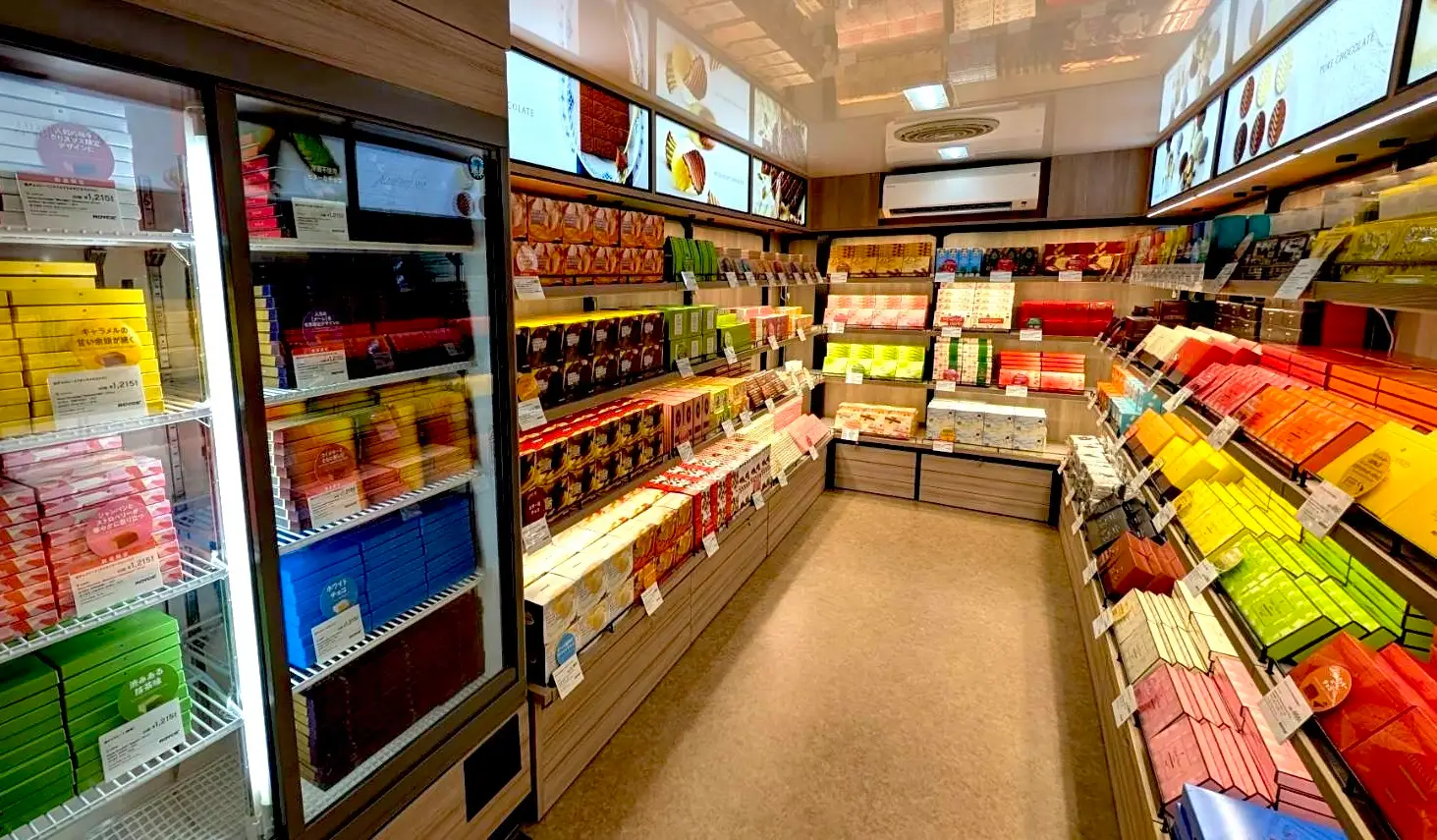 ⾞内では、⽣チョコレートやポテトチップチョコレートといった⼈気商品や限定商品など最⼤約90種類(※)を販売しています。限られたスペースながらも北海道物産展を超える豊富な品揃えの中から商品をお選びいただけます。お近くにお越しの際には、ぜひお⽴ち寄りください 。