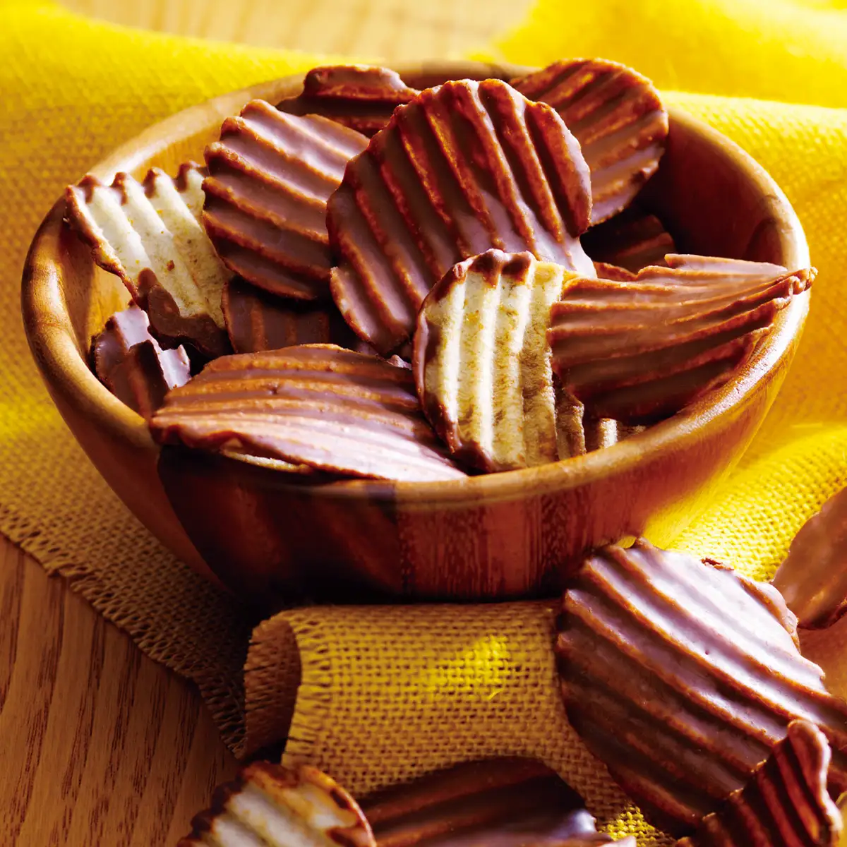 ポテトチップとチョコレート、意外な組み合わせから生まれた大ヒットのおいしさ。 パリッとした軽快な食感のポテトチップの片面に、口どけの良いチョコレートをコーティングしました。 チョコレートの甘さとポテトチップの塩味の絶妙なバランスがクセになるおいしさです。