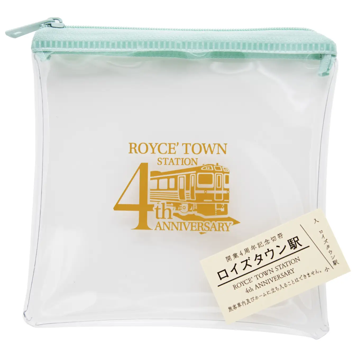 ロイズタウン駅4周年記念ロゴをデザインした、縦約13.5cm×横約13.5cmのクリアポーチです。