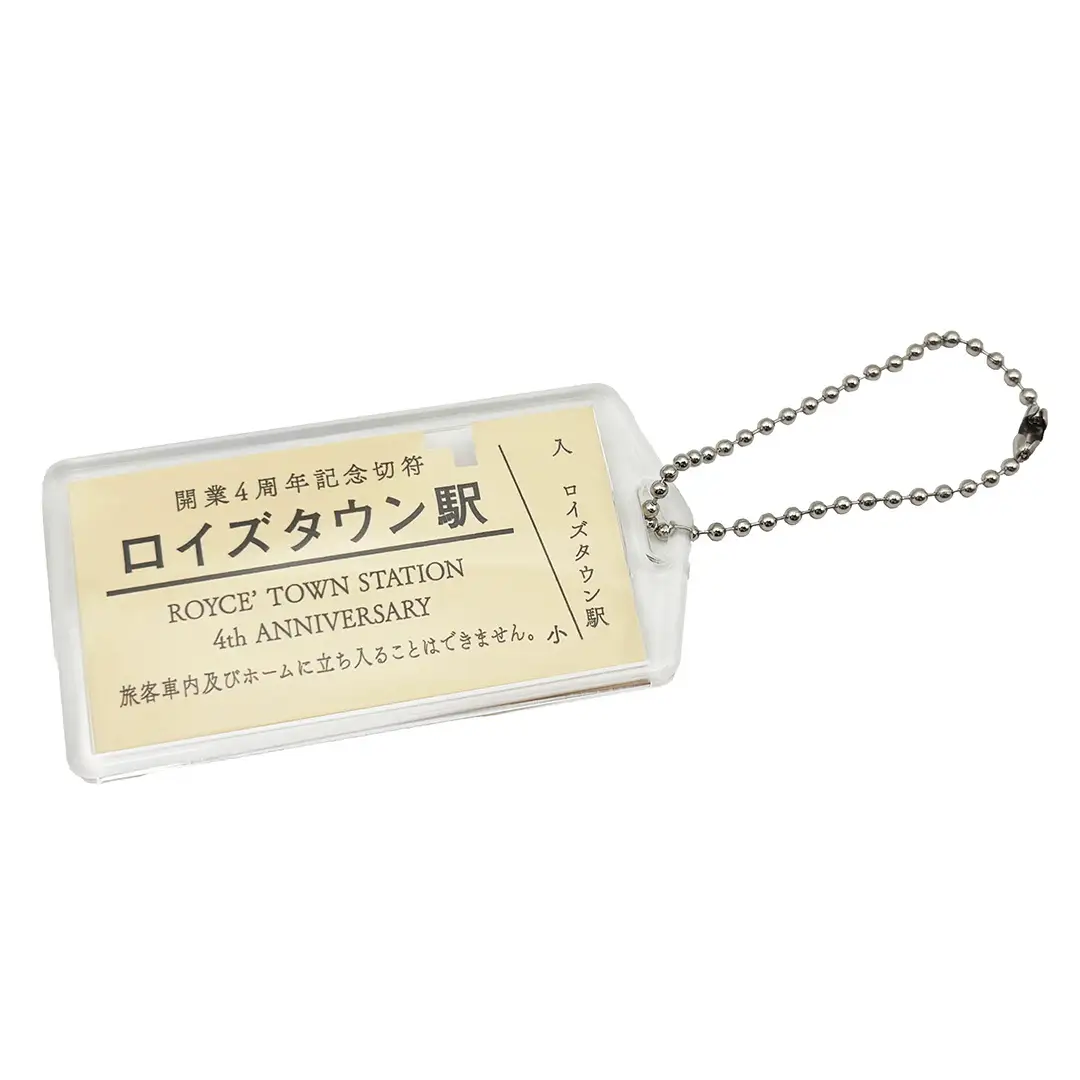 切符を模したオリジナルデザインのA型サイズの硬券です(縦約30㎜×横約57.5㎜)。チョコレート詰め放題体験の参加券として体験会場の受付でご提示いただき、入鋏させていただきます。またご希望の方には、入鋏後に記念硬券を持ち運べるキーホルダーを1個お渡しいたします。