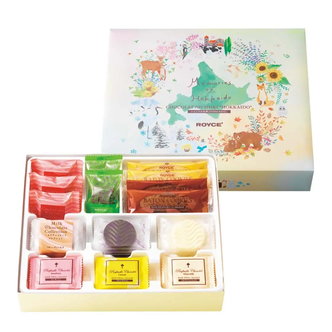 色や素材から、四季それぞれをイメージできるロイズのチョコレートをセレクトした詰め合わせです。パッケージには、北海道の動物や、北海道の四季折々の植物が美しく描かれています。自然豊かな北の大地に想いを馳せながら、ロイズのチョコレートをお楽しみください。