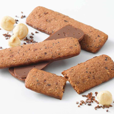 細かく砕いたカカオ豆とヘーゼルナッツパウダーをブレンドしたココア生地のクッキーの片面に、まろやかな味わいのチョコレートをコーティングしました。