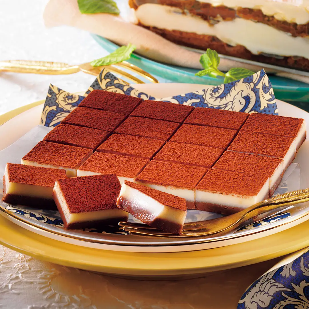 世界で愛されるイタリア生まれのデザート「ティラミス」をイメージした生チョコレート。マスカルポーネチーズのパウダーを入れたホワイトチョコレートガナッシュと、コーヒーとコーヒーリキュール入りのガナッシュを2層に重ねました。それぞれの層が引き立て合う、甘くてほろ苦い、深みのある味わいをお楽しみください。