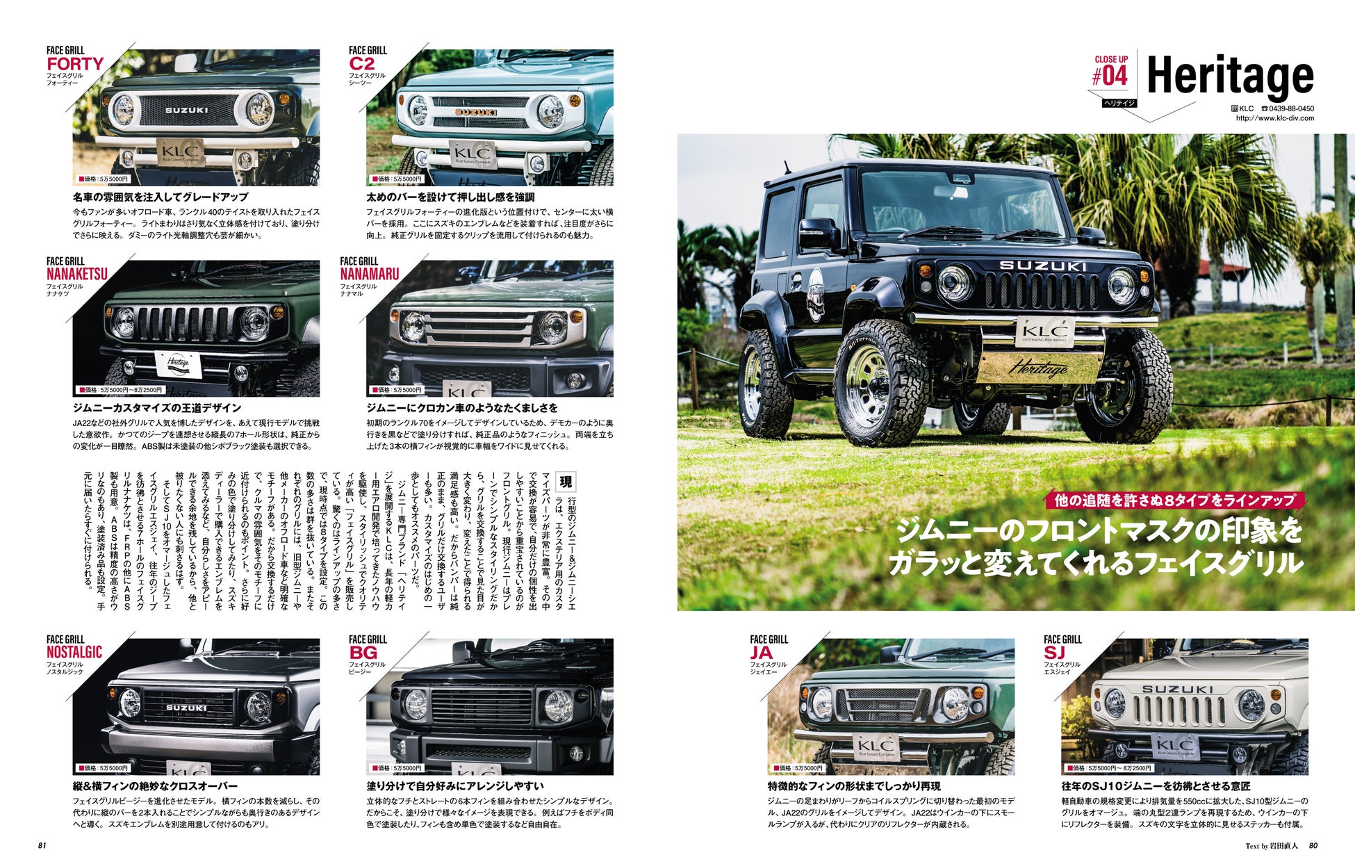 ジムニーの最新情報を詰め込んだ「クローズアップ」。KLCはフロントグリルに力を入れていて、何と8パターンも用意。好みやスタイルによって選んでみよう。