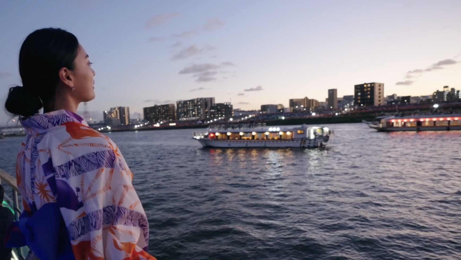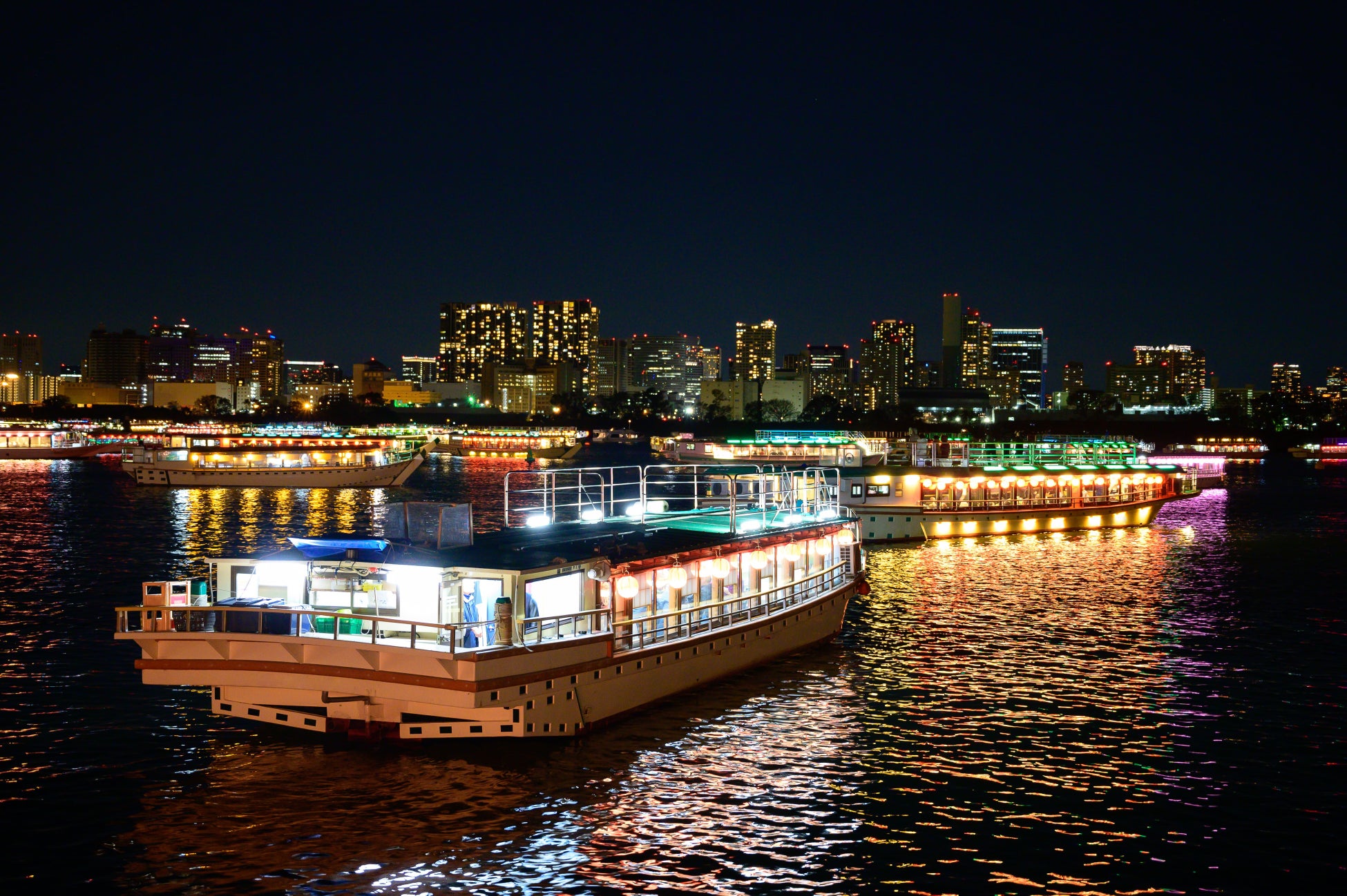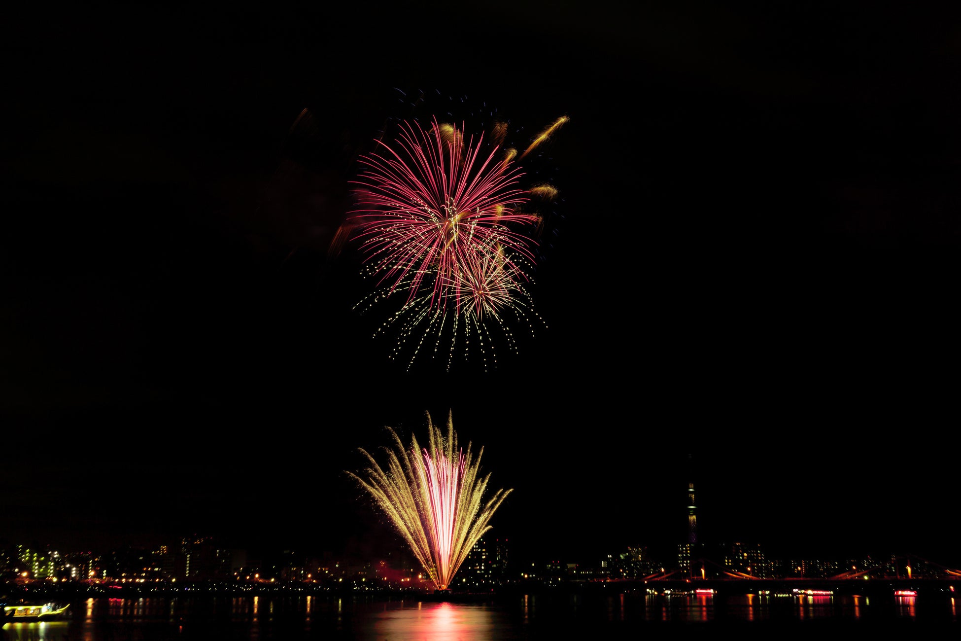 夜空に浮かび上がる都会のネオンや、迫力満点の花火が水面に映る美しい景色とともに、下町情緒が感じられる特別な夏の夜を楽しみください。