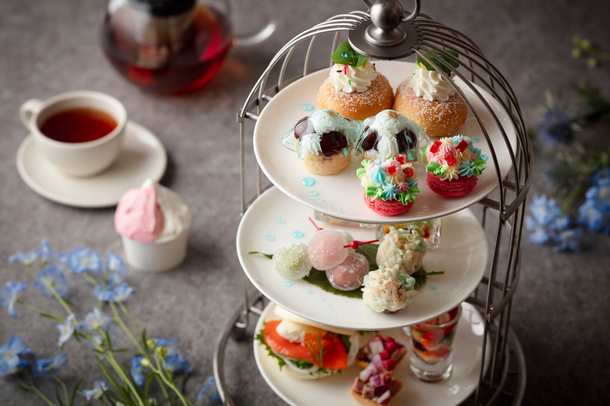 例年よりもやや遅く6月中旬ごろより梅雨入りが予想される本年。1年のうち、約100日霧が発生するといわれている軽井沢では特に梅雨に入るとじめじめとした日が続きます。そんな時期でも晴れやかな気持ちで滞在を楽しめるよう、梅雨の時期だからこそ楽しめる風情をたっぷり詰め込み、視覚でも味覚でも心ときめく華やかなアフタヌーンティーを今年もご用意いたしました。昨年好評だった季節の風物詩である色鮮やかなあじさいを象ったスイーツに加えて、本年はさらに傘をイメージしたチェリーのタルト、雨上がりの空にかかる虹を彷彿させるカラフルなスイーツを多彩に盛り込み、晴れ間を願う気持ちと雨上がりの晴れやかな情景を表現したアフタヌーンティーになりました。