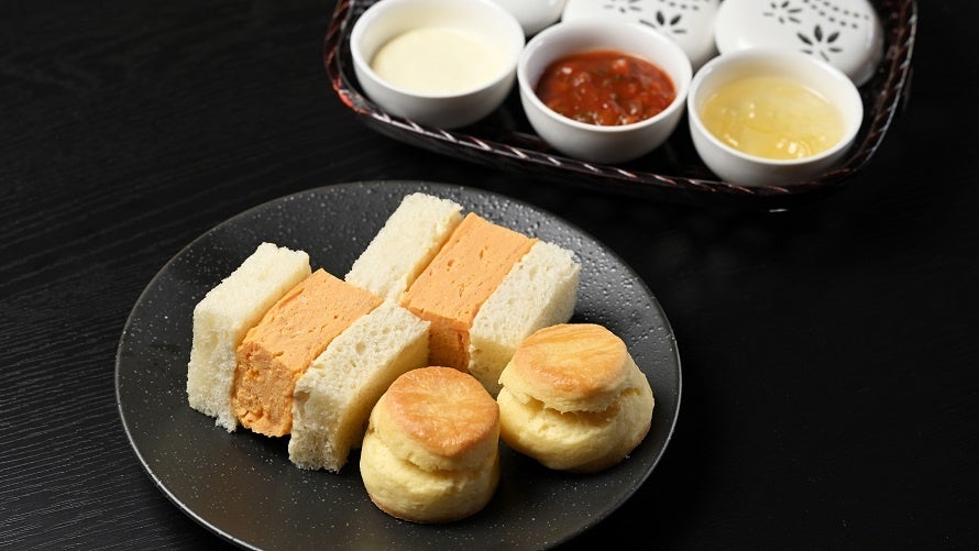 京小麦「せときらら」を使用した人気の生食パンで「日本料理 宝ヶ池」のジューシーなだし巻きをサンドしました。西京味噌を合わせたマヨネーズがアクセントです。