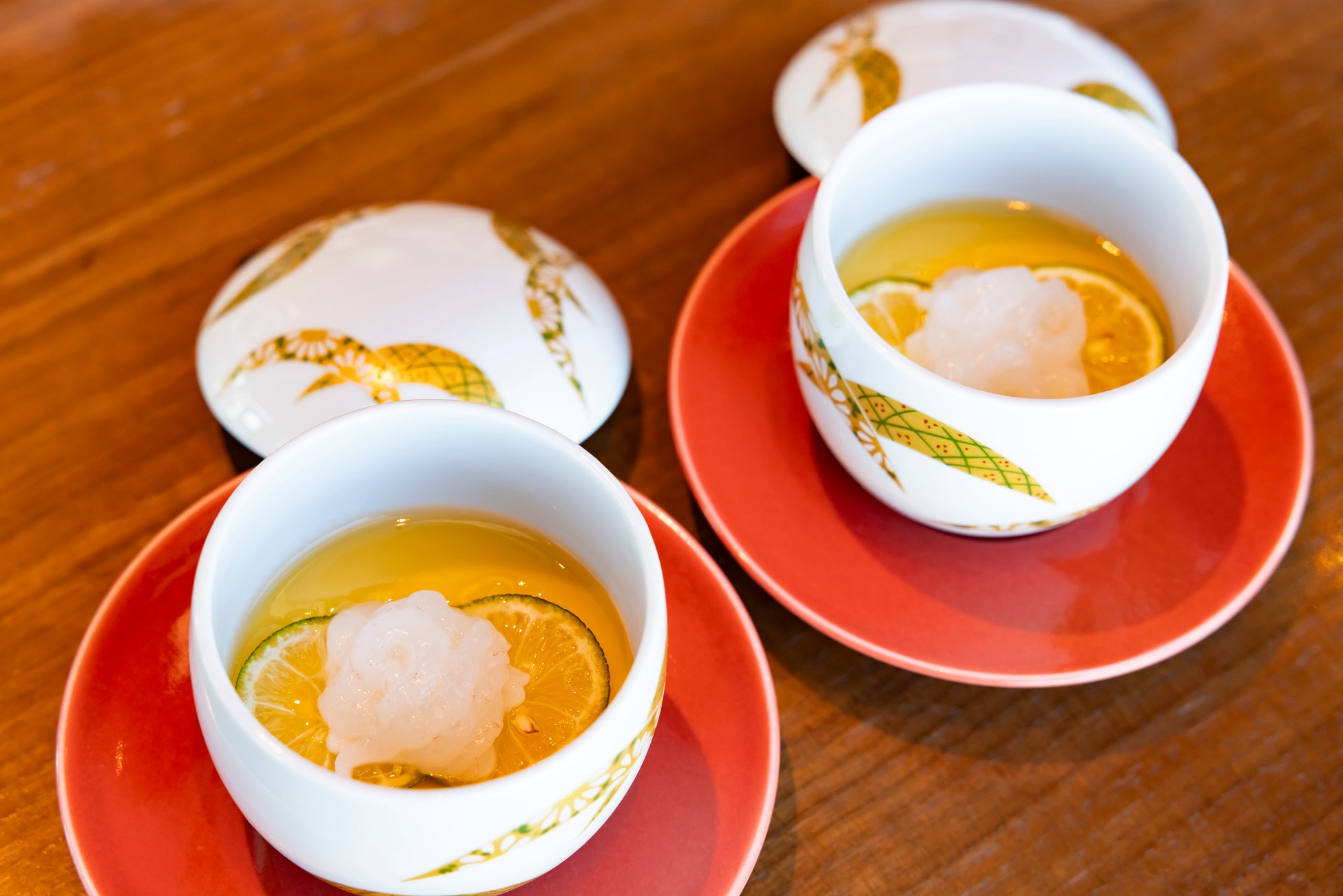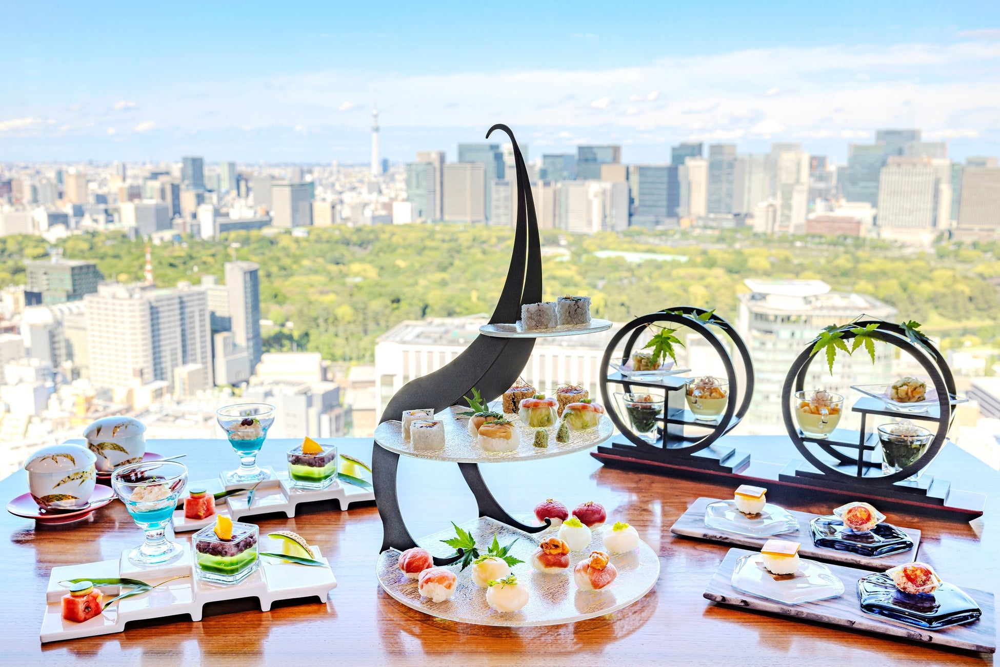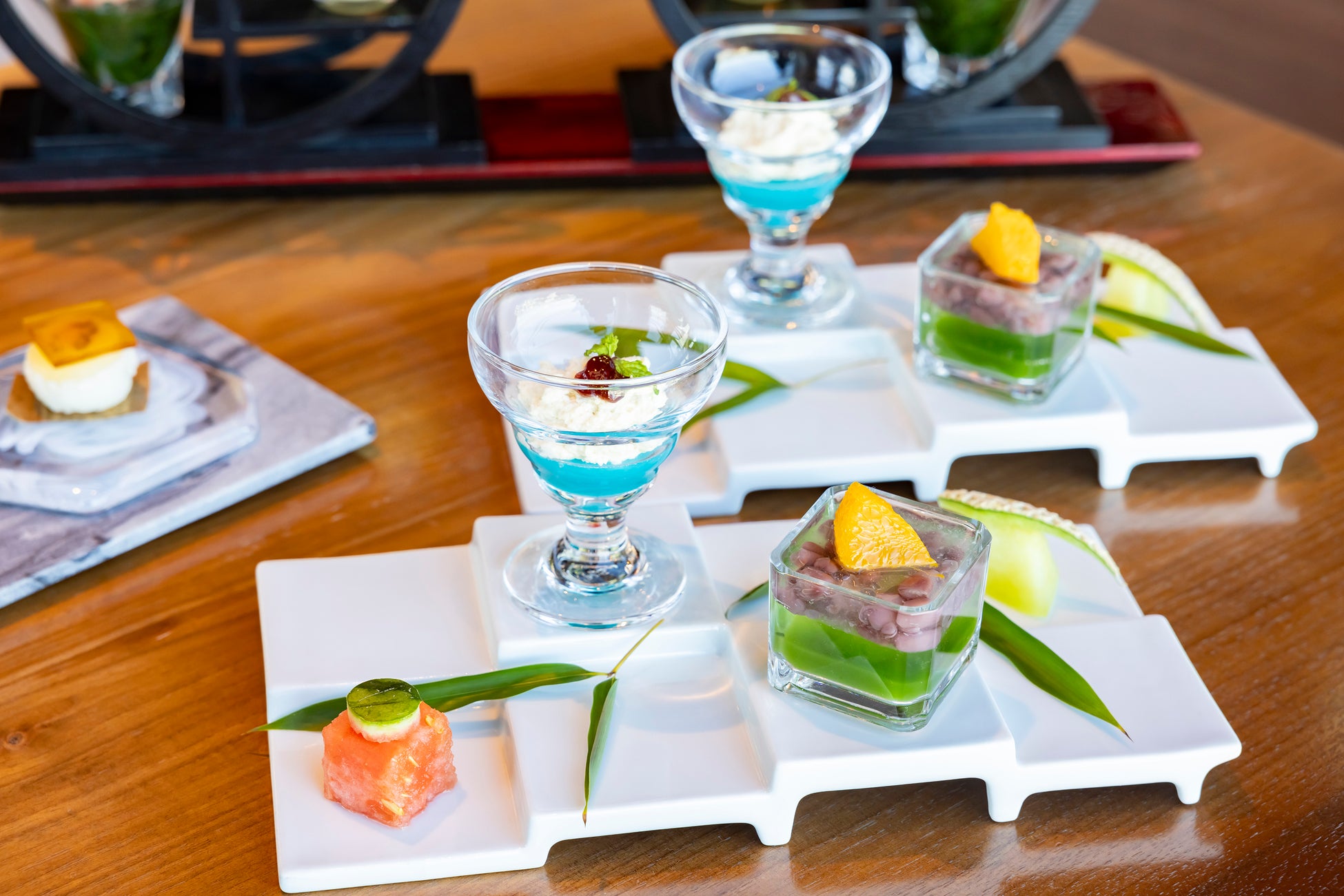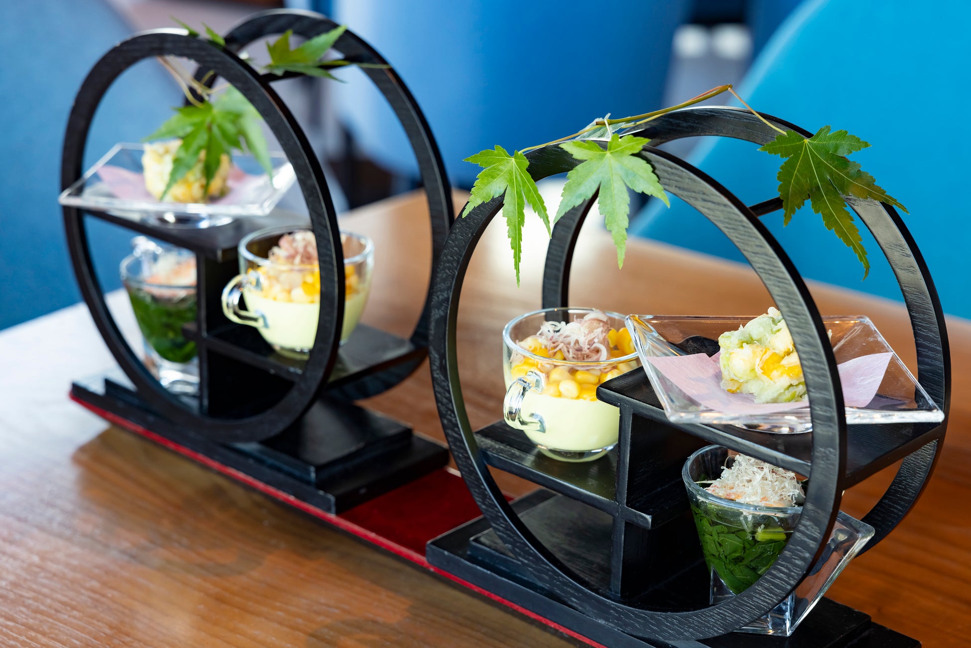 そのほか、酢橘の酸味と海老の出汁でさっぱりとした味わいの茶わん蒸しや抹茶の水羊羹など、季節ならではの味わいをラインナップしました。ホテルから望める緑豊かな東京の景色と共に、ご友人やご家族とゆったりと涼みながら夏の味覚をお楽しみいただける和のアフタヌーンティーをご提案いたします。