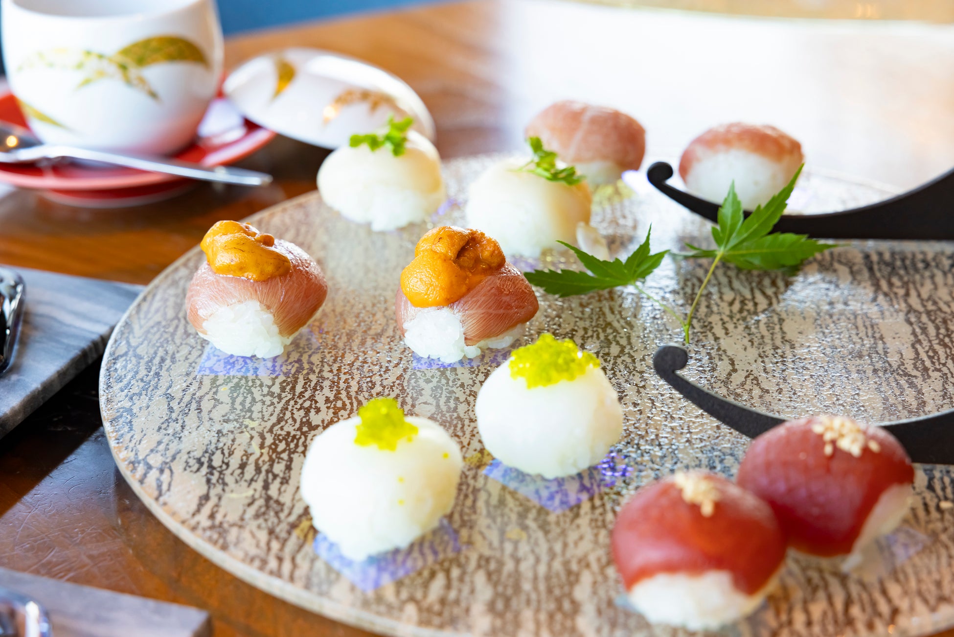 夏の味覚として、前菜には季節のお浸しや玉蜀黍のムース、枝豆と黄色ズッキーニのかき揚げをご用意。12種類のお寿司は、大トロや、雲丹を乗せた中トロ、帆立のほか、トマト風味のシャリに3色のトマトとワイン風味の透明な膜をかぶせた手毬寿司やのし梅を乗せたキウイフルーツ手毬寿司、シャリをレタスやピリ辛の海老と一緒にライスペーパーで包んだ手毬寿司、胡瓜で梅水晶をはさみ氷餅をまぶしたロール寿司など、職人が食材の味を活かしながらICEをイメージして丁寧に作り上げました。