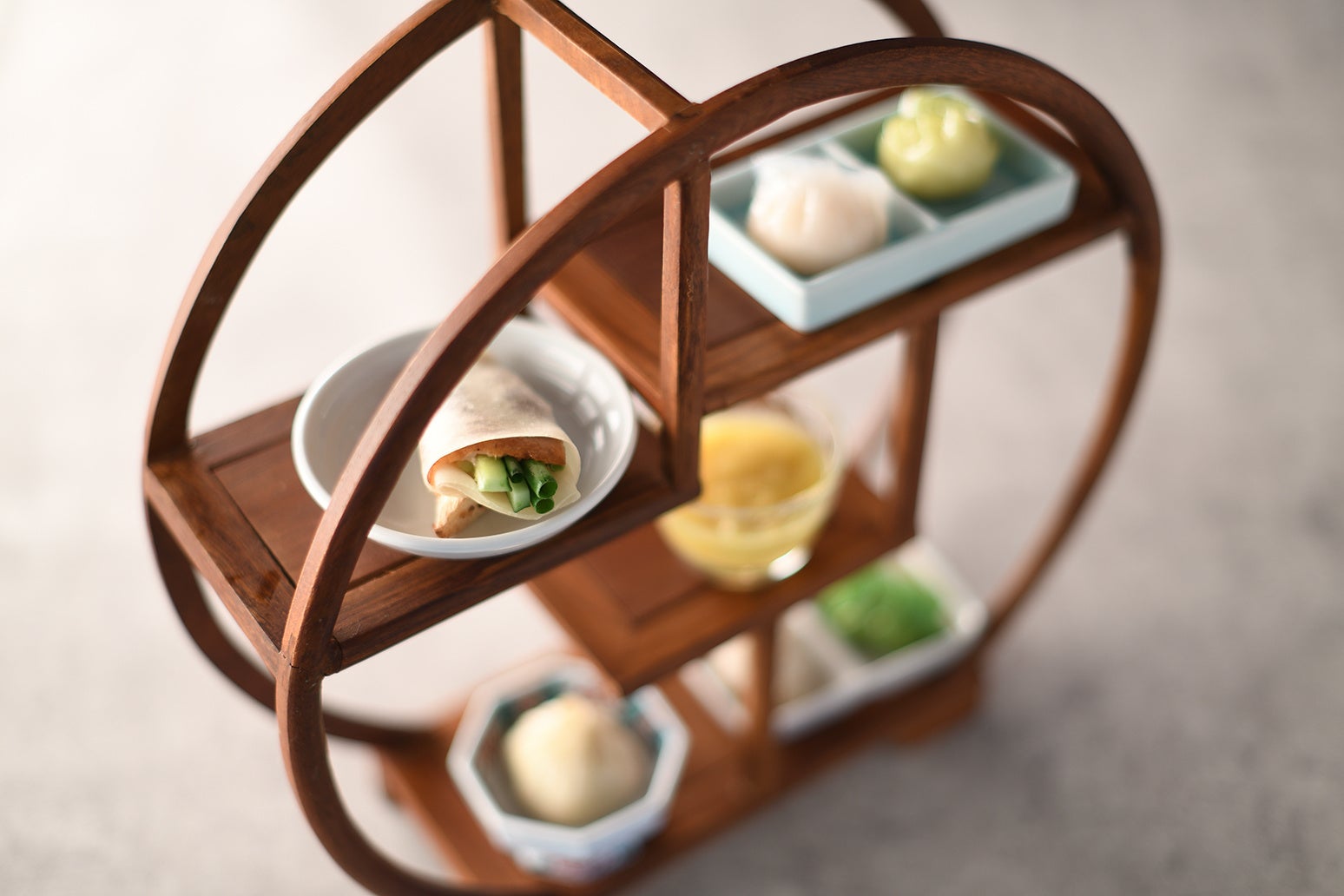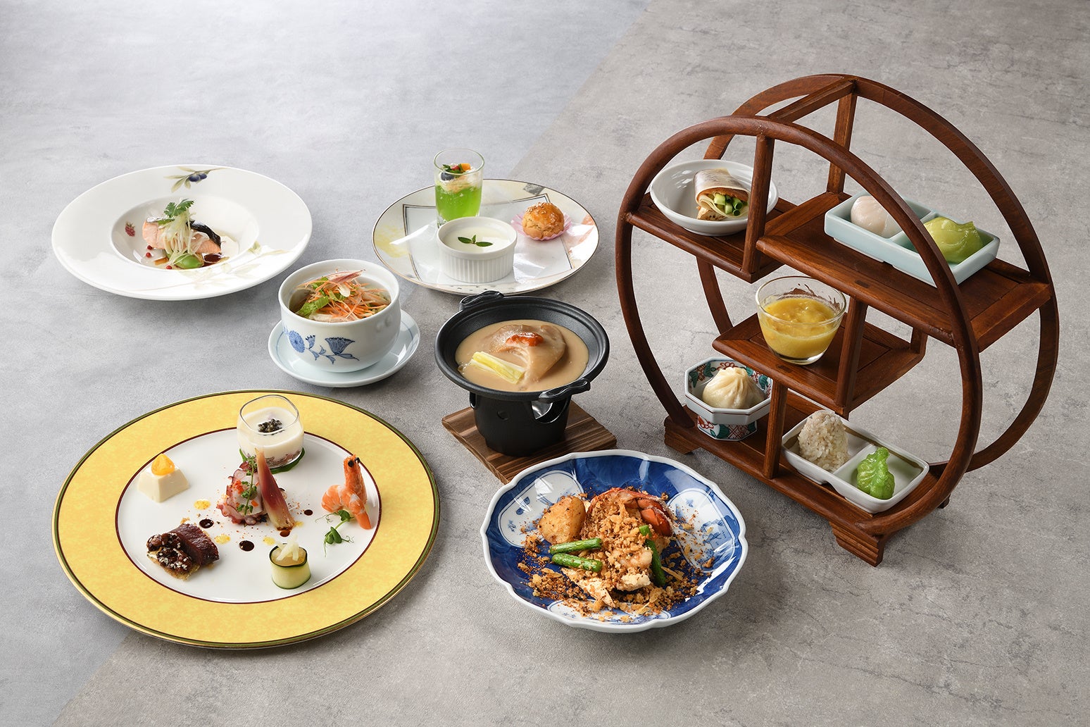 ・ 伝統のスタンド盛り(彩り五種点心、北京ダック、冷製コーンスープ)