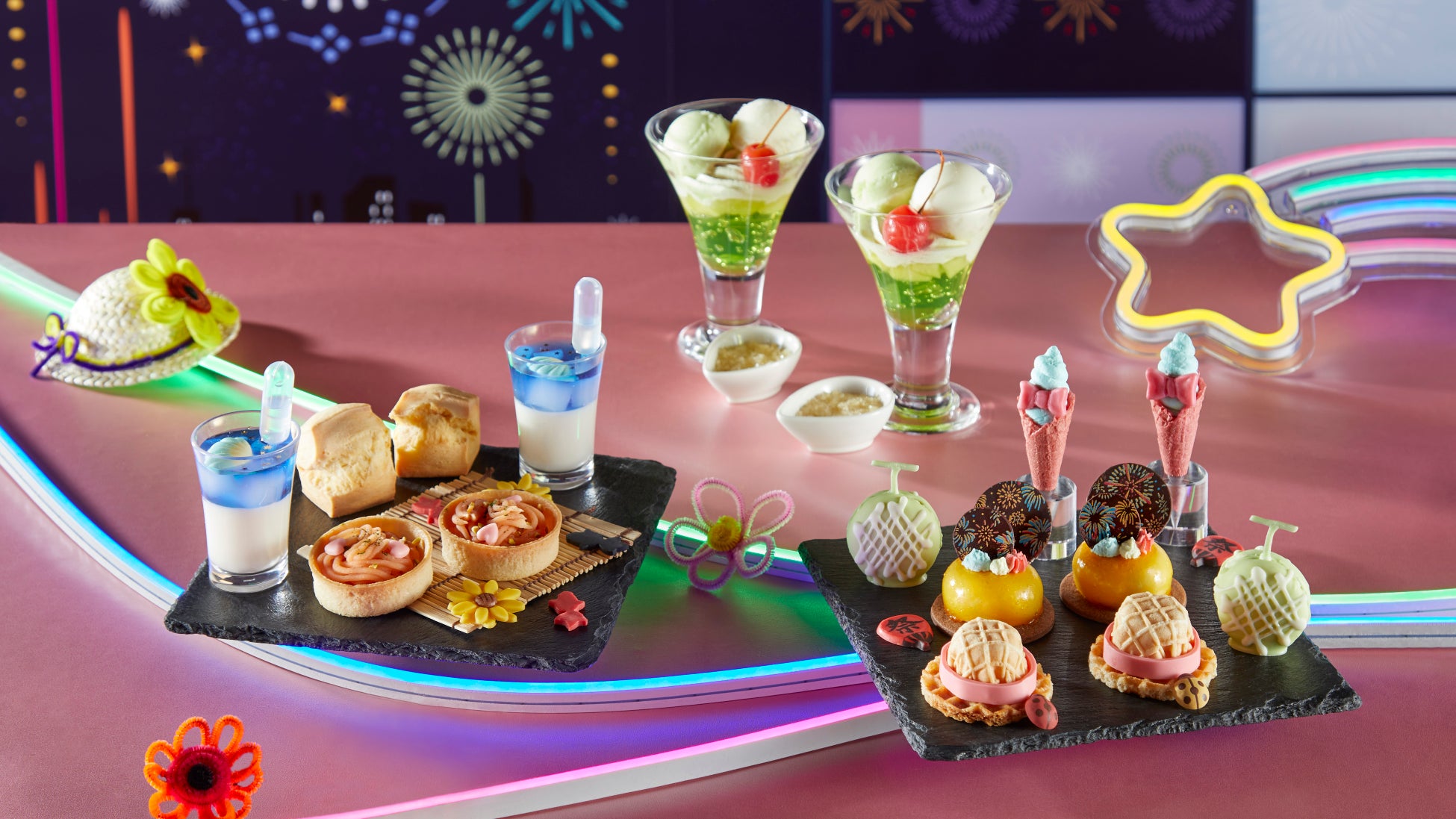 わくわくするような“夏”を表現したメニューには、日本の夏の風物詩である花火や麦わら帽子のスイーツ、夏に楽しみたいバーベキューをイメージし、野菜やお肉を串焼きにした「気分はBBQ!」をご用意いたしました。随所に新宿らしさとしてネオンカラーを取り入れ、ポップな“夏”をお楽しみいただけます。