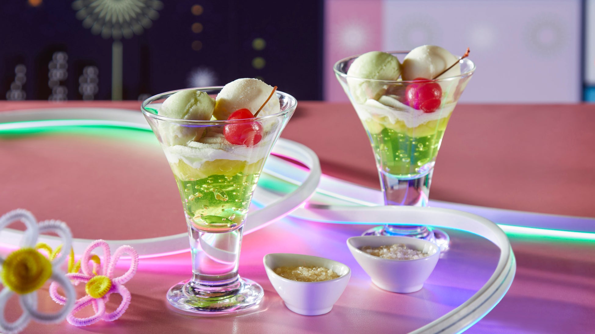 5. 昔から大人気なクリームソーダを表現した「夢のクリームソーダぱふぇ」は、別添えのぱちぱち飴をお好みで飾りつけ、口の中で弾ける音と食感をお楽しみいただけます。