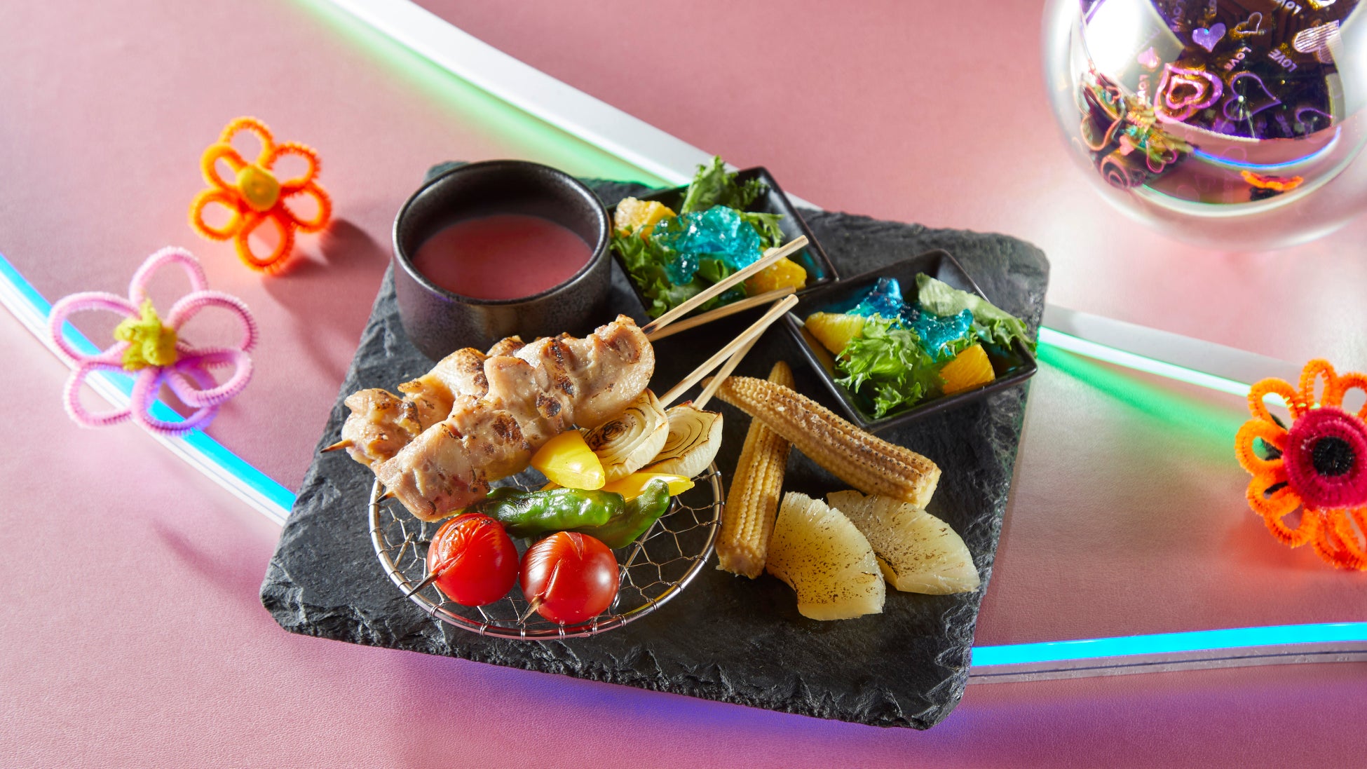 3. セイボリープレートの「気分はBBQ!」は、ピンクのネオンカラーが特徴的なチーズソースを焼きとり串や、野菜たっぷり串にお好みでかけてお召し上がりいただけます。