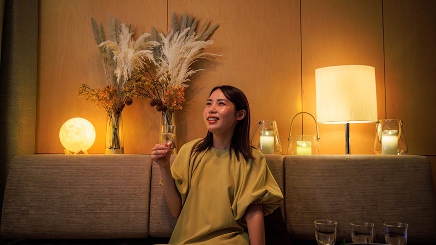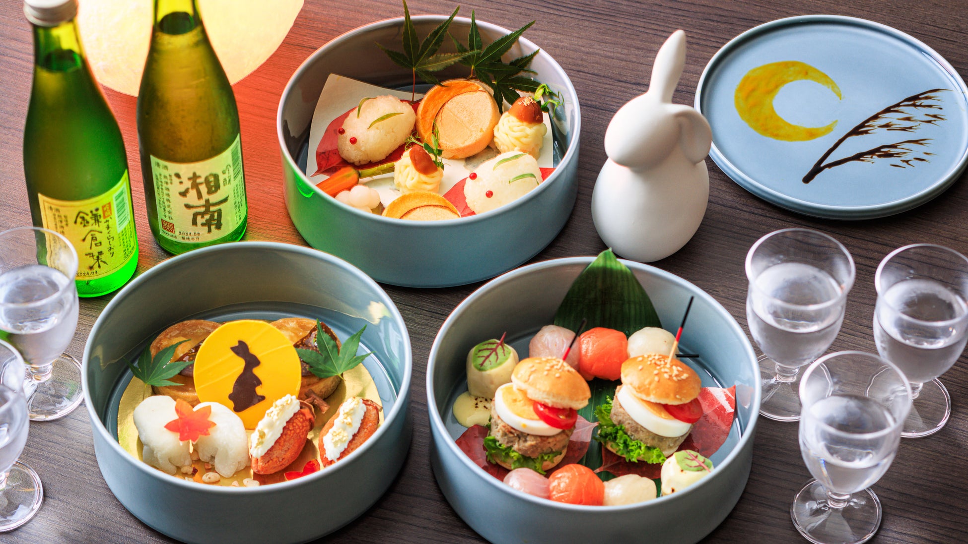 心地よい風が吹き、澄んだ空に月が美しく輝く季節。1日1組限定の「ほろ酔い部屋飲み体験」では、お月見コンセプトルームにて、軽食と熊澤酒造の日本酒がお楽しみいただけます。軽食は、くし団子に見立てた一口手毬寿司やお月見をイメージした照り焼きエッグバーガーなど、お月見にぴったりなメニューをご用意いたしました。熊澤酒造の日本酒3種を飲み比べながら、優雅な秋の夜長をお過ごしいただけます。
