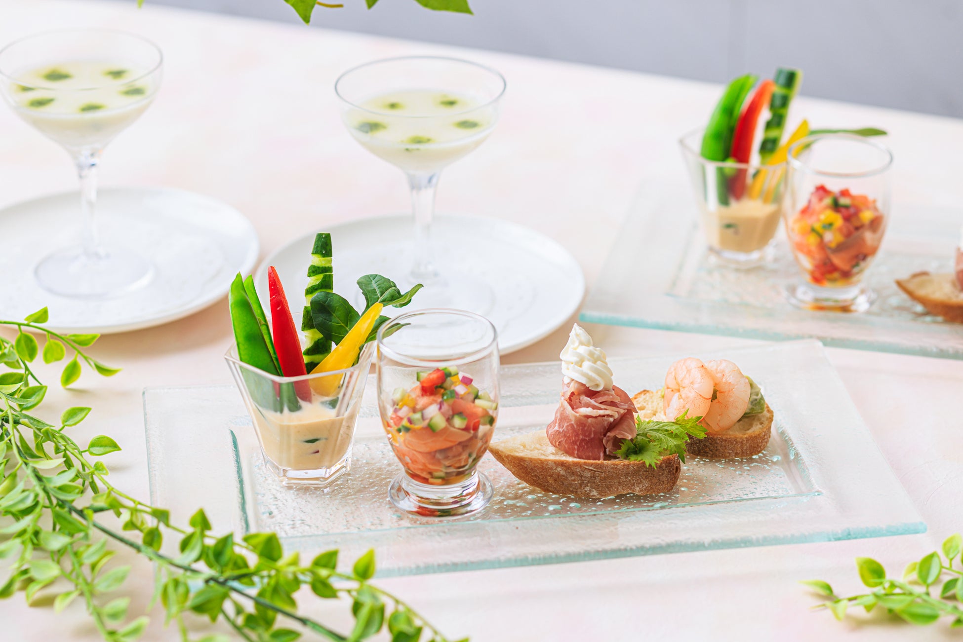 バジル風味のポテトの冷製スープ、スモークサーモンのロミロミ風、2種のカナッペ(生ハムとクリームチーズ、エビとアボカド)、野菜スティック 西京味噌のディップソース