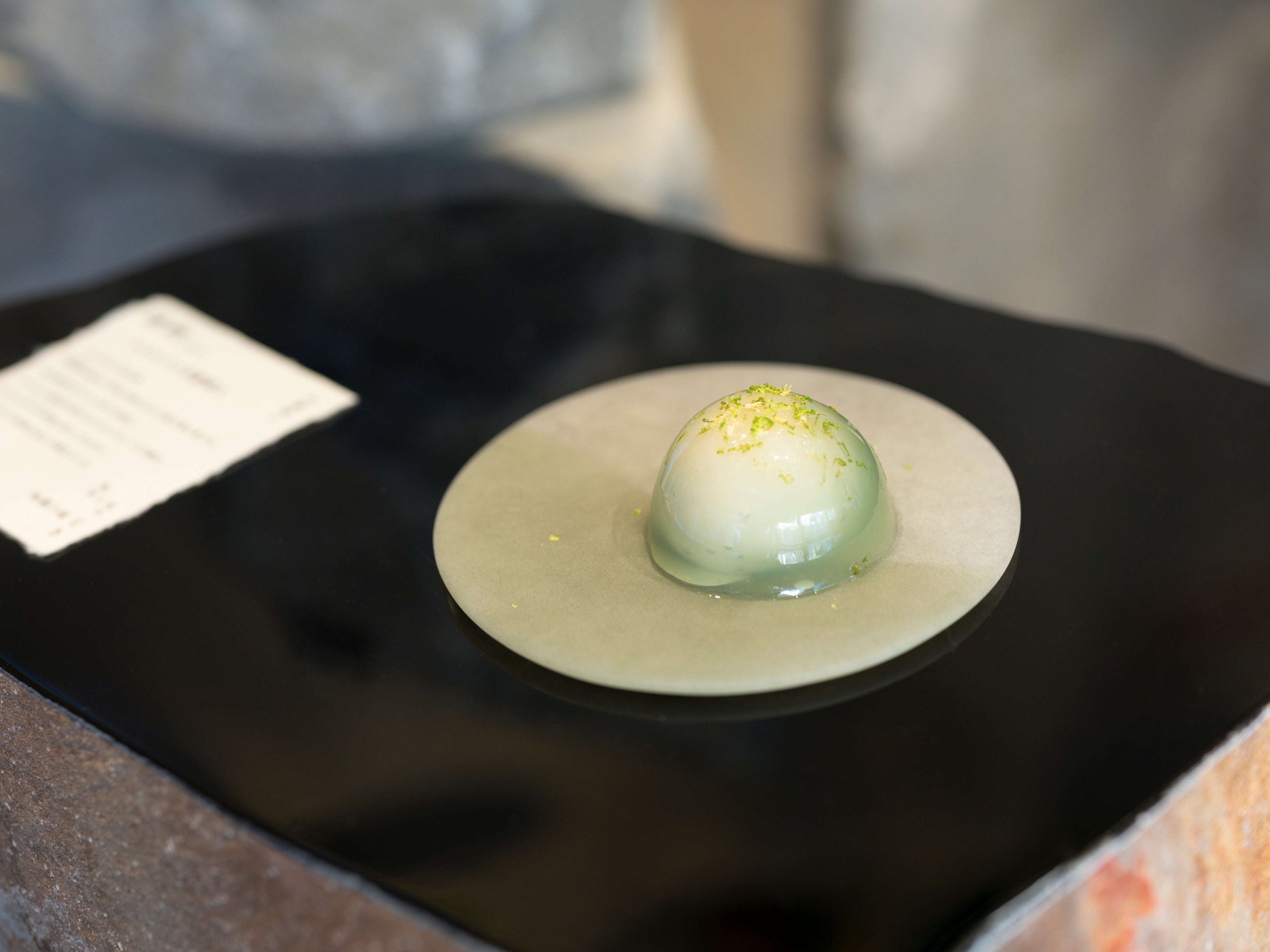 しんと冷えた秋の朝。睫毛や鼻の頭に感じる霜始降(しもはじめてふる)の澄んだ空気を閉じ込めたような錦玉製の菓子は、日本薄荷、レモングラス、ライムの香りを湛え、包まれたアーモンド風味の餅の中には瑞々しいマスカットと白餡が。センシュアルな食感と、口内や脳裏に広がる澄んだ空気に身を委ねる瞬間。清々しさの中に、今日一日への高揚の兆しが満ちている。