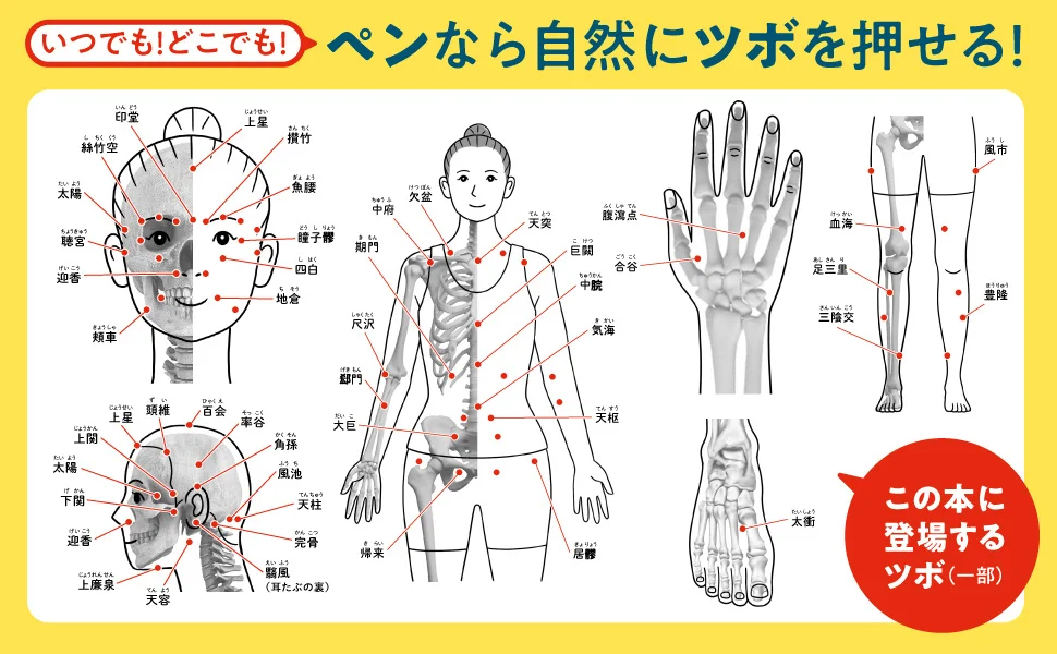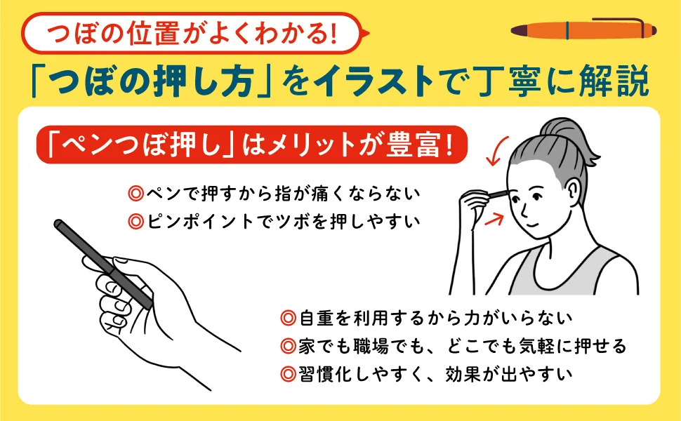 指のツボ押しでは指や手首を痛めやすいが、ペンは誰でも持っていて、力の加減がしやすく、適切なツボをしっかり推すことができる。とくにツボ押しに向くペンの選び方も紹介。