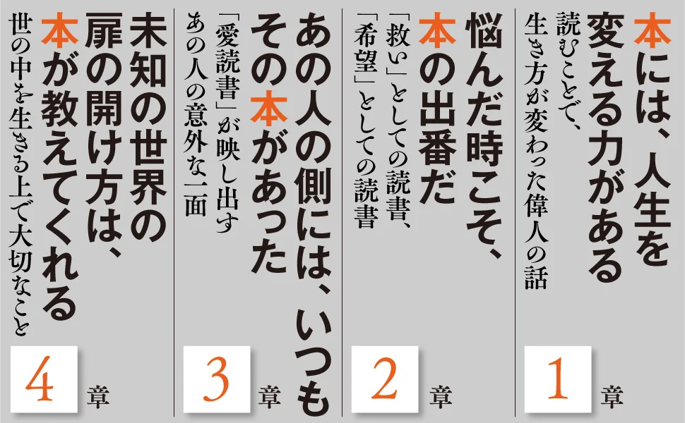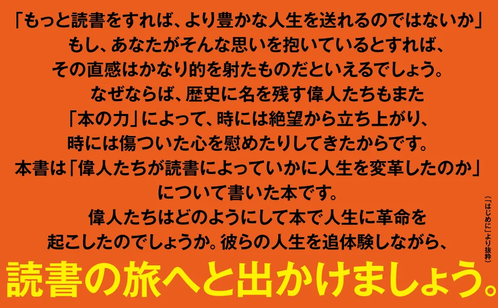 本との関係を通して、著名人たちの人物像に新たな角度から光を当てるのと同時に、古今東西の名著が持つ不変の哲学を読み解きます。本書は、「本が持つ力」を心の底から実感できる一冊です。