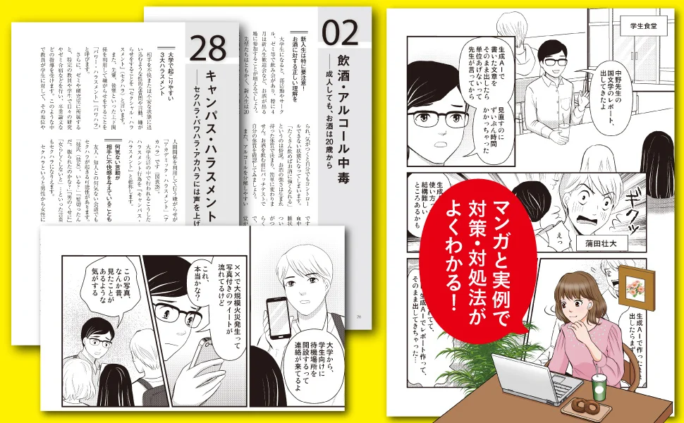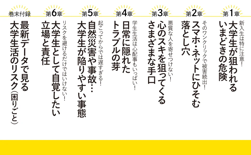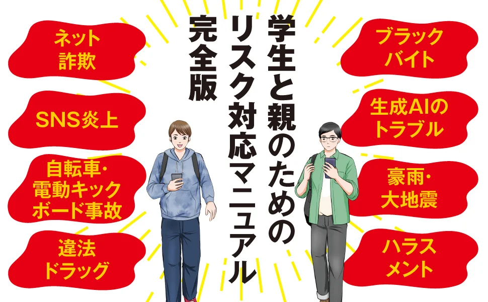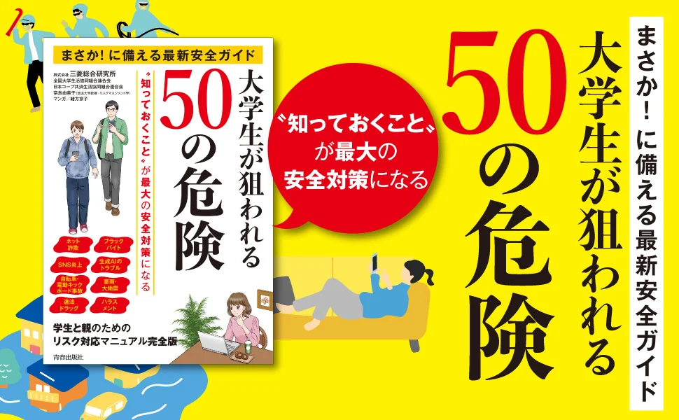 急増するSNS・スマホのトラブル、巧妙化するネット詐欺、闇バイト、自転車・電動キックボード事故、豪雨・大地震、カルト、ハラスメント、ストーカー、飲酒・アルコール中毒……大学生が陥りやすい50の危険をピックアップ。
