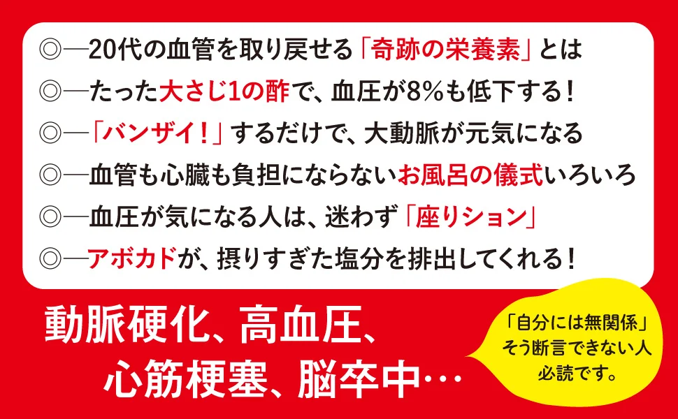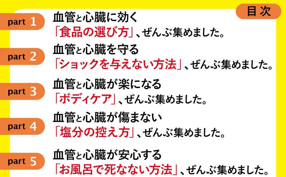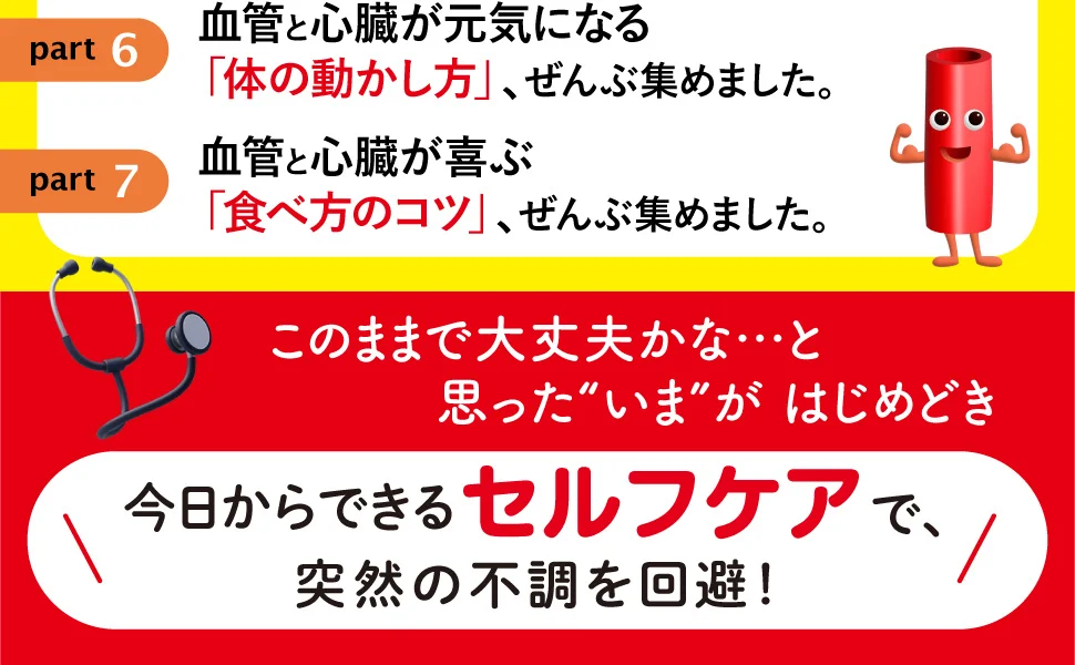 ……など高血圧、動脈硬化、コレステロール、中性脂肪といった健診結果が気になる項目に直結する、血管と心臓を健やかに保つための習慣を多角的に紹介します。