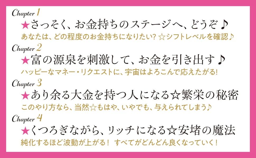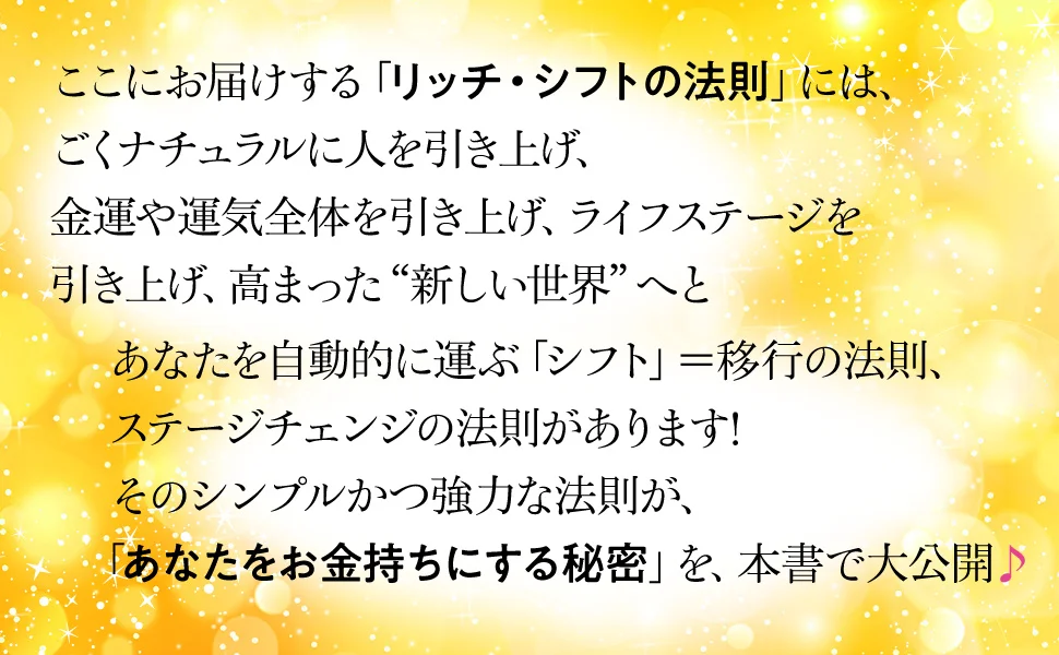ここにある「リッチ・シフトの法則」を知れば、まるでエレベーターに乗ったかのように自動的にステージチェンジを叶え、あなたは新しい世界へと運ばれる! そのとき、「金運」は、“徐々に”ではなく、“いきなり垂直に跳ね上がる!” そして、あり余るお金を持つ人に!