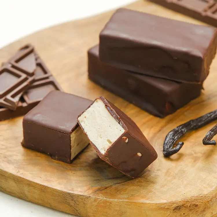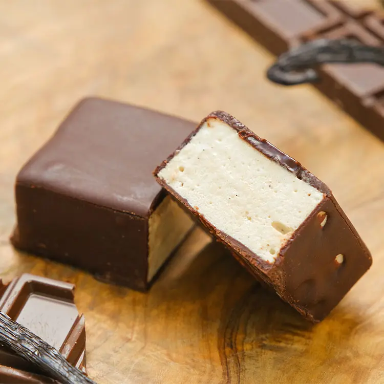澄ましバターを加えたなめらかなチョコと、バニラ香るもっちりマシュマロ。米飴ときび糖で仕上げたすっきりとした後味が、日常のひと息を贅沢な時間へ。