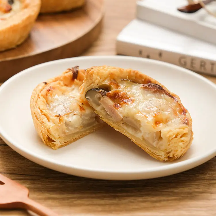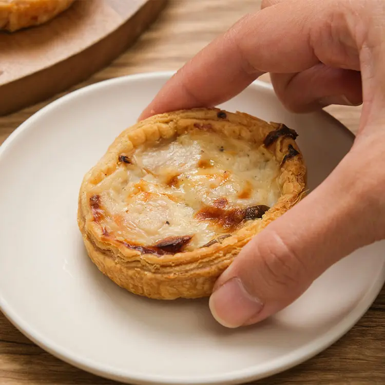 本商品は、バターの香りが立つサクサクのパイ生地に、手作りのベシャメルソース、ぷりっとしたえび、香り豊かなきのこをたっぷりと閉じ込めました。えびの旨味と無添加ソーセージのコクが重なり合い、パルメジャーノのコクのある風味が口いっぱいに広がる濃厚なグラタンパイです。バターが香ばしく立つサクサクのパイ生地が、中のとろりとしたソースと対比し、ひと口ごとに食感と旨みが広がります。小ぶりなサイズで温めも簡単。冬の朝食や軽食、夜の一皿にも使いやすい一品に仕上げました。