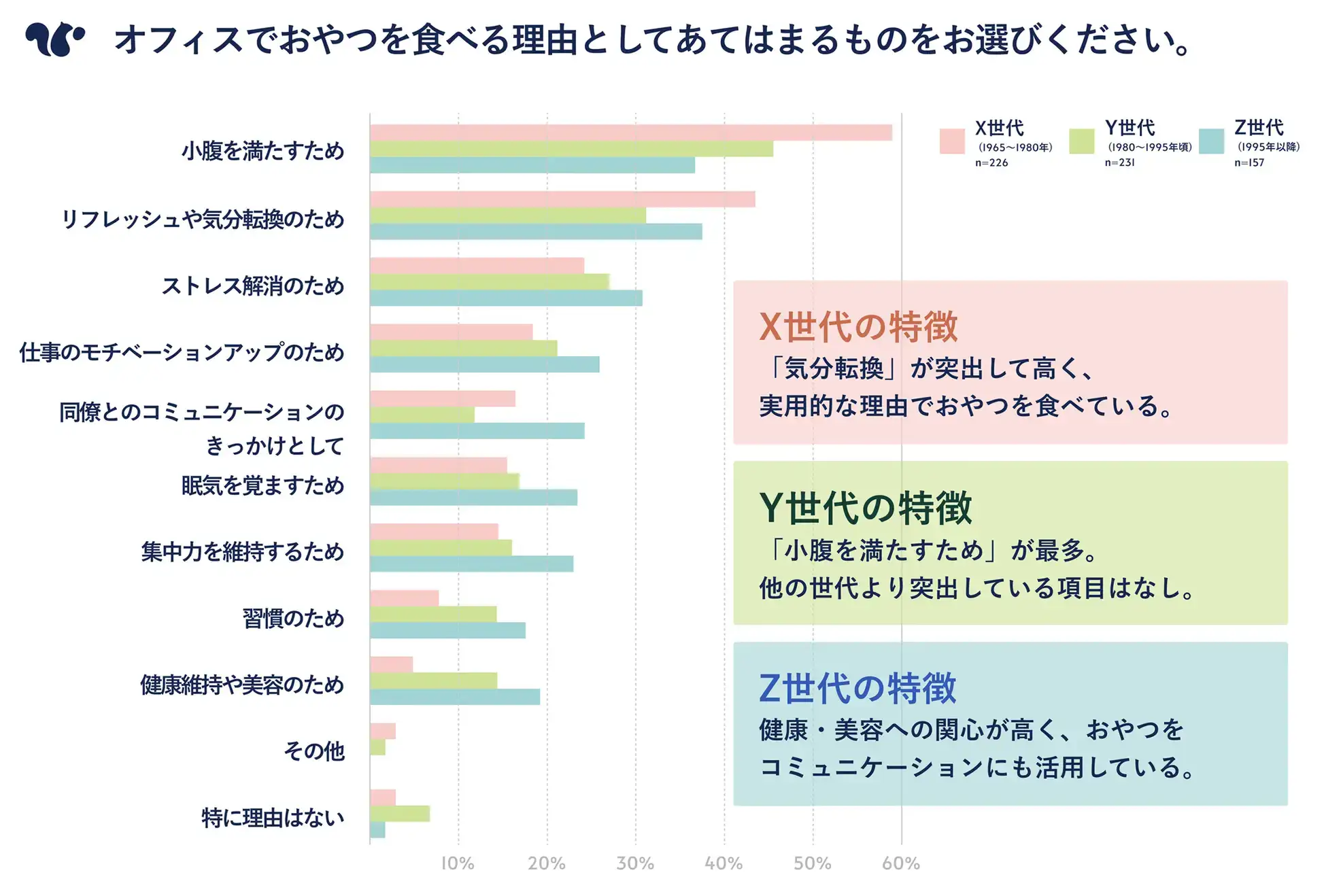 同社が実施した「オフィスでの間食に関する世代間調査」では、世代によっておやつを楽しむ理由や感じる効果が異なり、特に若い世代では「健康」や「コミュニケーション」といったウェルビーイングの意識が強いことがわかりました。