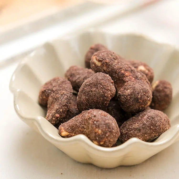 自家焙煎したカシューナッツにコクのある甜菜含蜜糖とほろ苦くて香り高いココアをまぶしました。使っている油脂はココアバターのみなので、ココアバターならではのなめらかな口どけに仕上がっています。