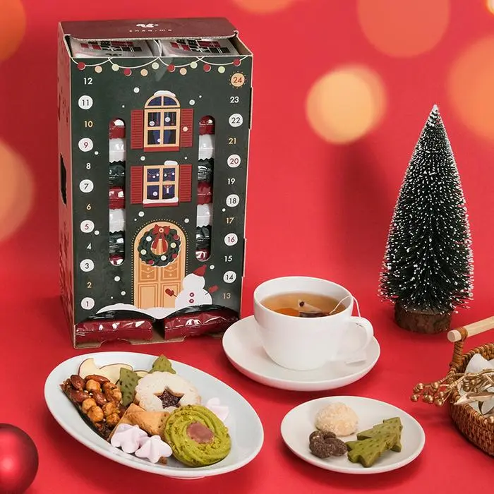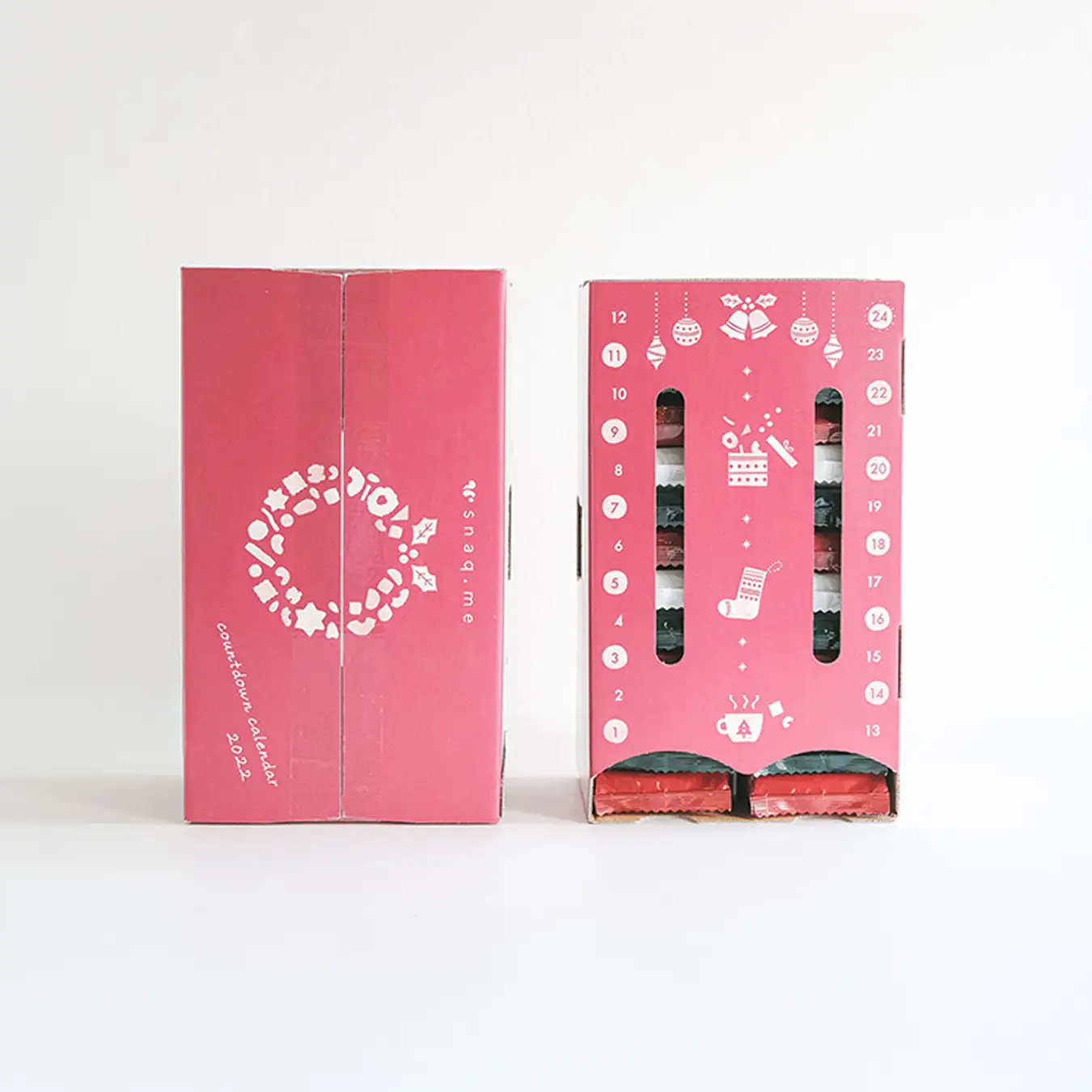 引き出し型の特製BOXの中には、スナックミーのおやつが全部で24個。12月1日からスタートすると、クリスマスイブまで毎日お楽しみいただけます。最終日(24日目)には、オリジナルブレンドの限定クリスマスティー入り。ホリデー気分を味わいながらカウントダウンする特別仕様です。