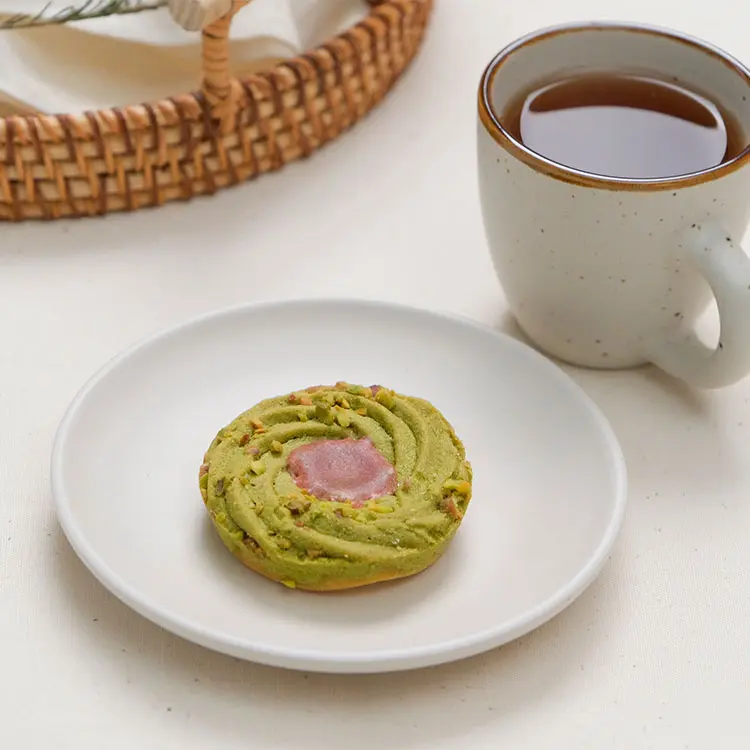 緑と赤のコントラストがクリスマスカラーでかわいらしいリース型のクッキーです。香ばしいピスタチオのザクザク感とラズベリーアイシングの甘酸っぱくてシャリっとした食感が楽しいですよ。