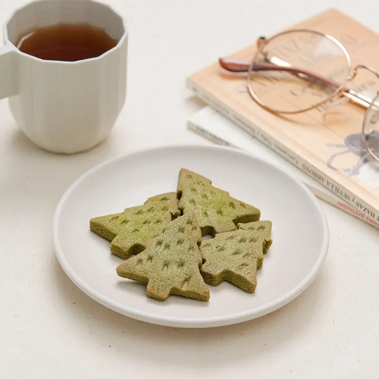 少し厚焼なザクっとした食感で、やさしい甘さのきび糖と香り高い宇治抹茶がふんわりと香るクッキーです。もみの木型がかわいらしく、葉っぱの模様も心をこめてひとつずつ手作業でつけました。