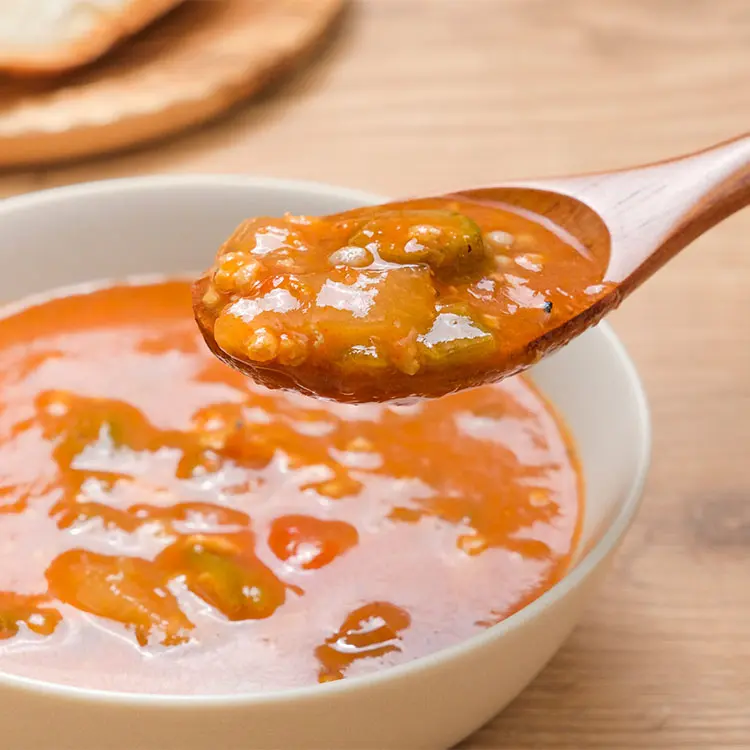 原材料:チキンブイヨン、オクラ、鶏ひき肉、たまねぎ、トマト・トマトピューレづけ、ベーコン、ピーマン、海老、セロリ、バター、薄力粉、オリーブオイル、にんにく、ウスターソース、塩、ケイジャンスパイス、胡椒、ローレル