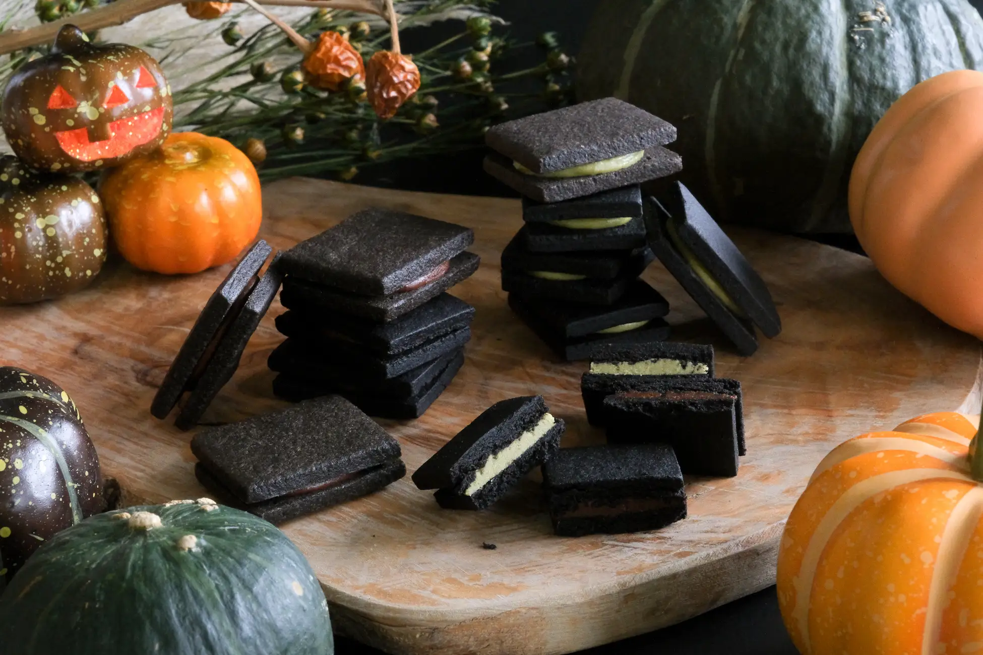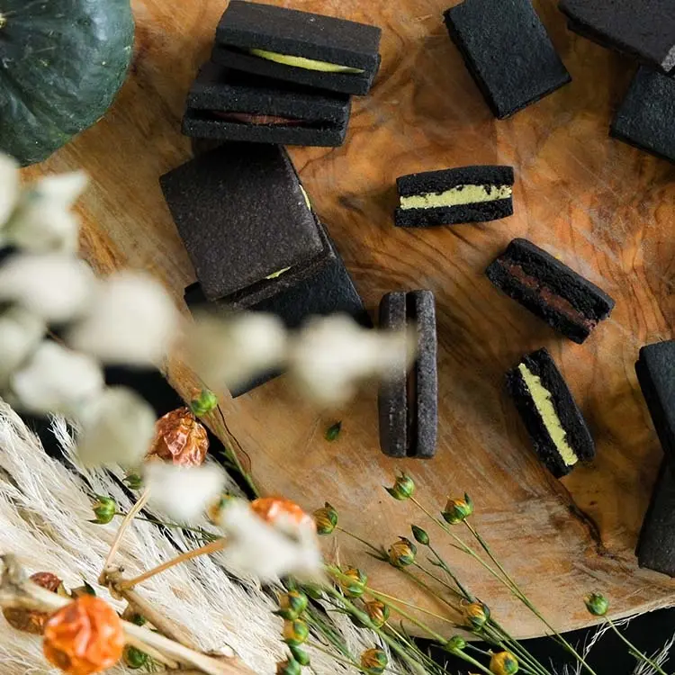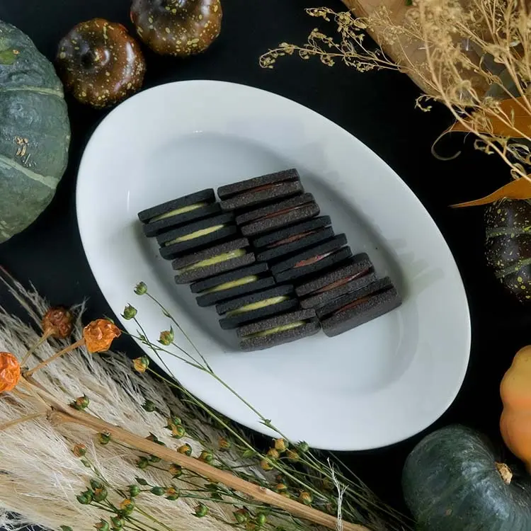 真っ黒なさくさくクッキーで2種類のクリームを挟み、ハロウィン限定のブラックおやつを作りました。ほろ苦いココアクッキーと、甘く香ばしいナッツ×チョコレートのクリームが相性抜群です。