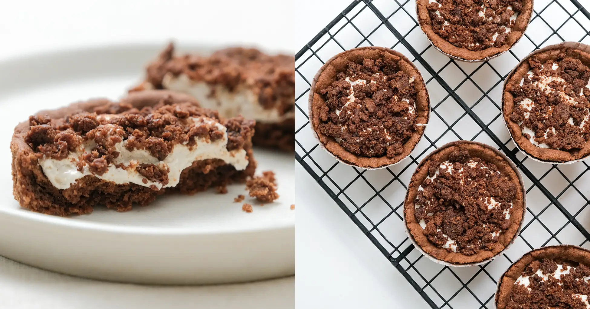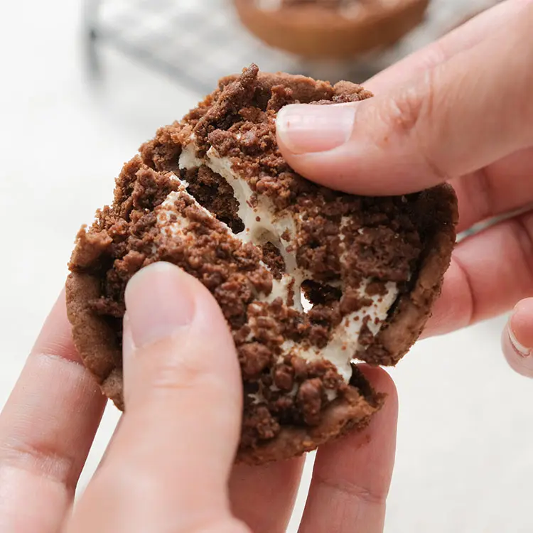 ソフトなココアクッキー生地にマシュマロをのせ、仕上げにサクサクのクランブルをトッピングしました。そのまま食べるとフワモチっとしたマシュマロの食感、温めるととろ〜り溶けたマシュマロの食感が楽しめます。