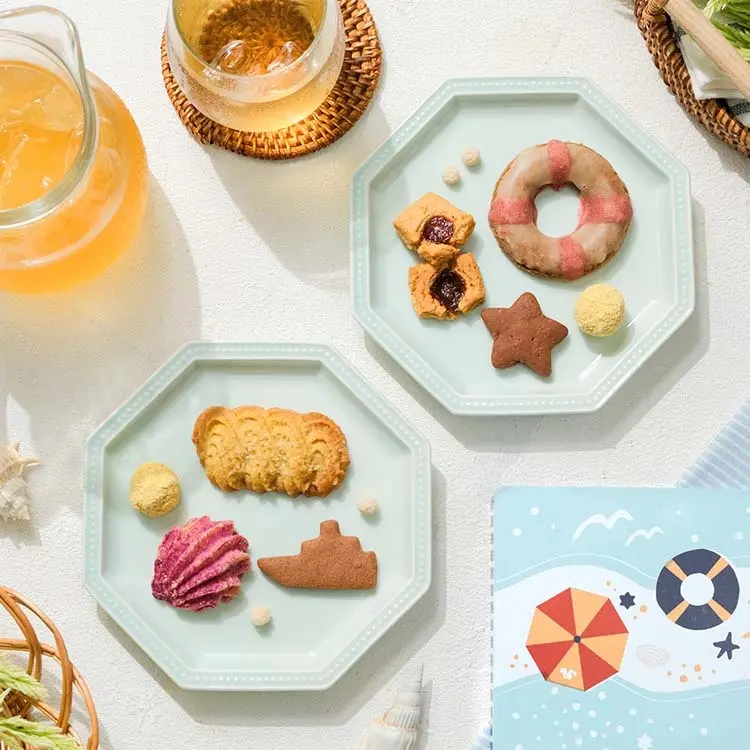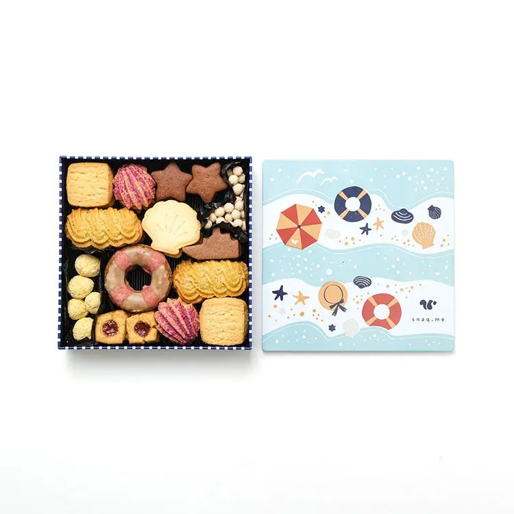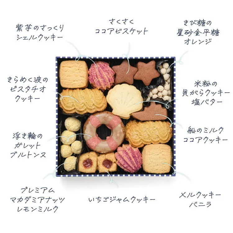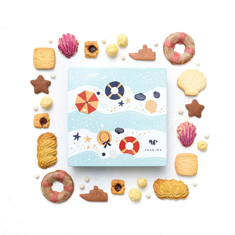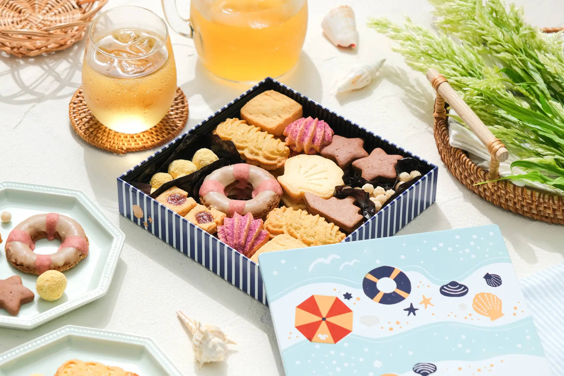 浮き輪や貝がら、きらめく波――夏の海辺を彩るモチーフをふんだんに散りばめました。缶のフタを開ければ、潮風に揺れる浮き輪や波打つ海を思わせるクッキーたちがぎっしり。目にも舌にも涼やかな夏のご褒美をお届けします。