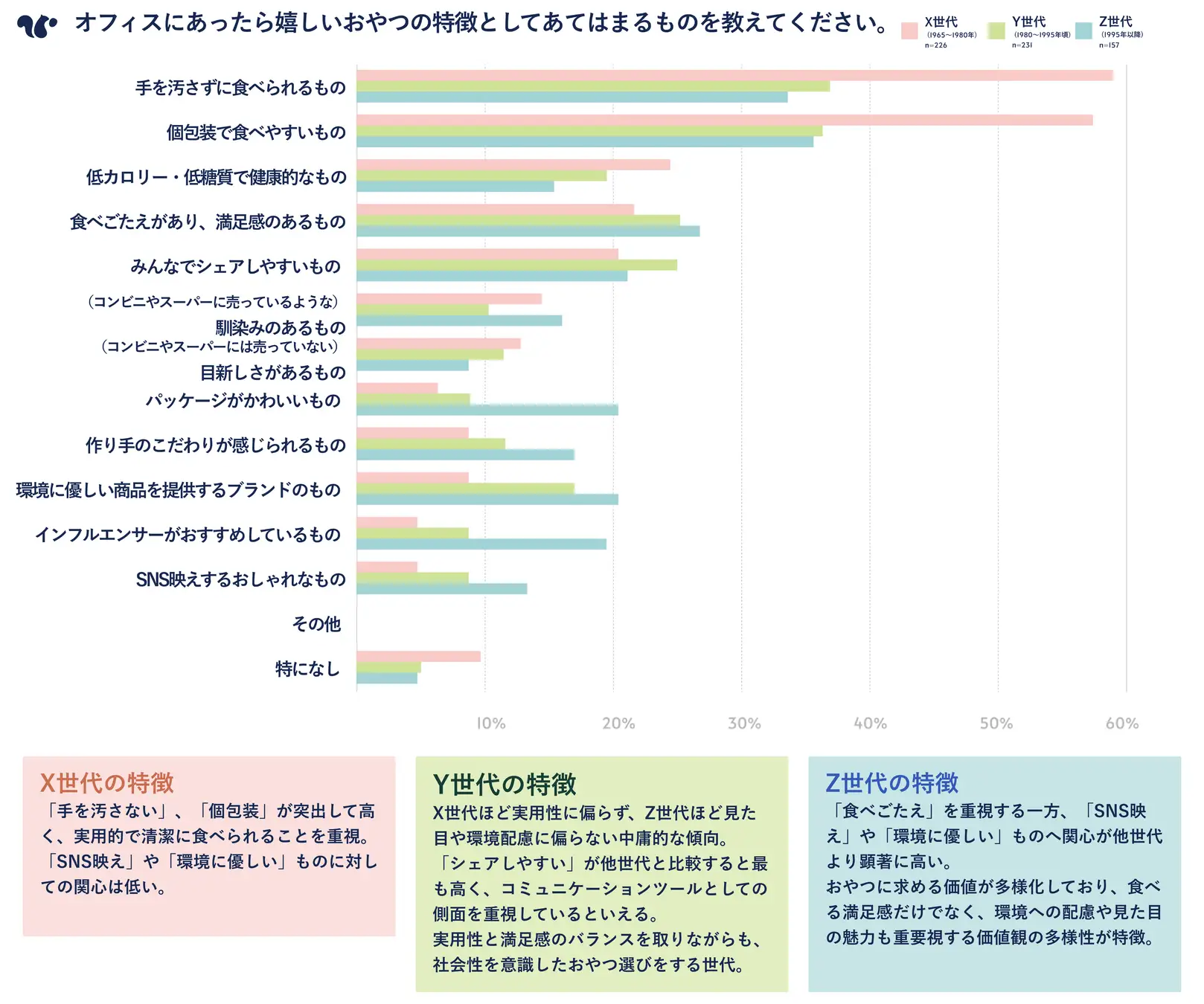「個包装」(36.4%)や「手を汚さずに食べられる」(33.9%)も一定の支持がある一方、「環境に優しい商品」(20.4%)はX世代の3.5倍、「SNS映えするおしゃれなもの」(13.6%)も2.8倍と、環境意識やビジュアルへの感度の高さが際立ちます。